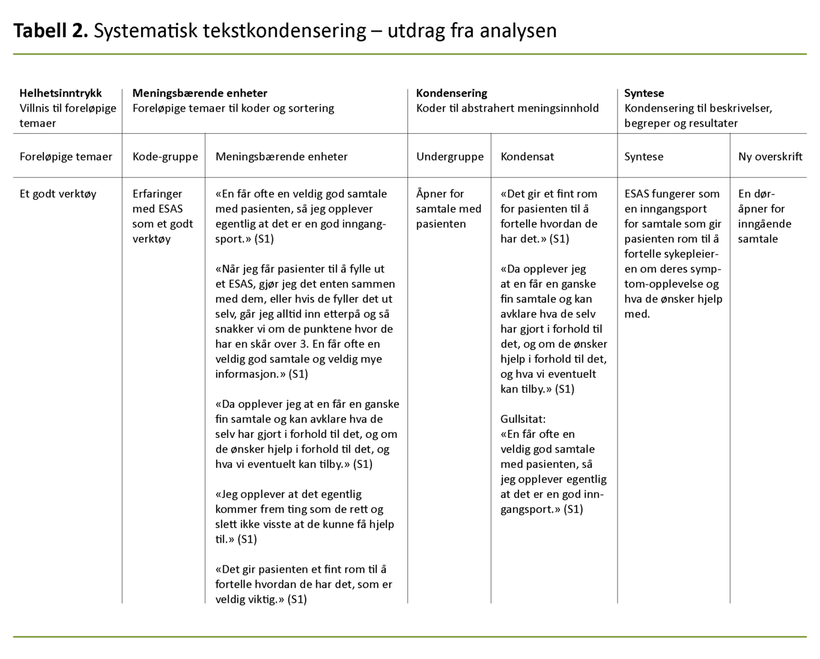 Vi brukte en fortolkende tverrgående analyse basert på Malteruds systematiske tekstkondensering. Analysemetoden består av fire trinn. Se tabell 2 for utdrag av analysen. I trinn 1 «Helhetsinntrykk» ble materialet lest gjennom flere ganger for å få et helhetsinntrykk og finne foreløpige temaer.