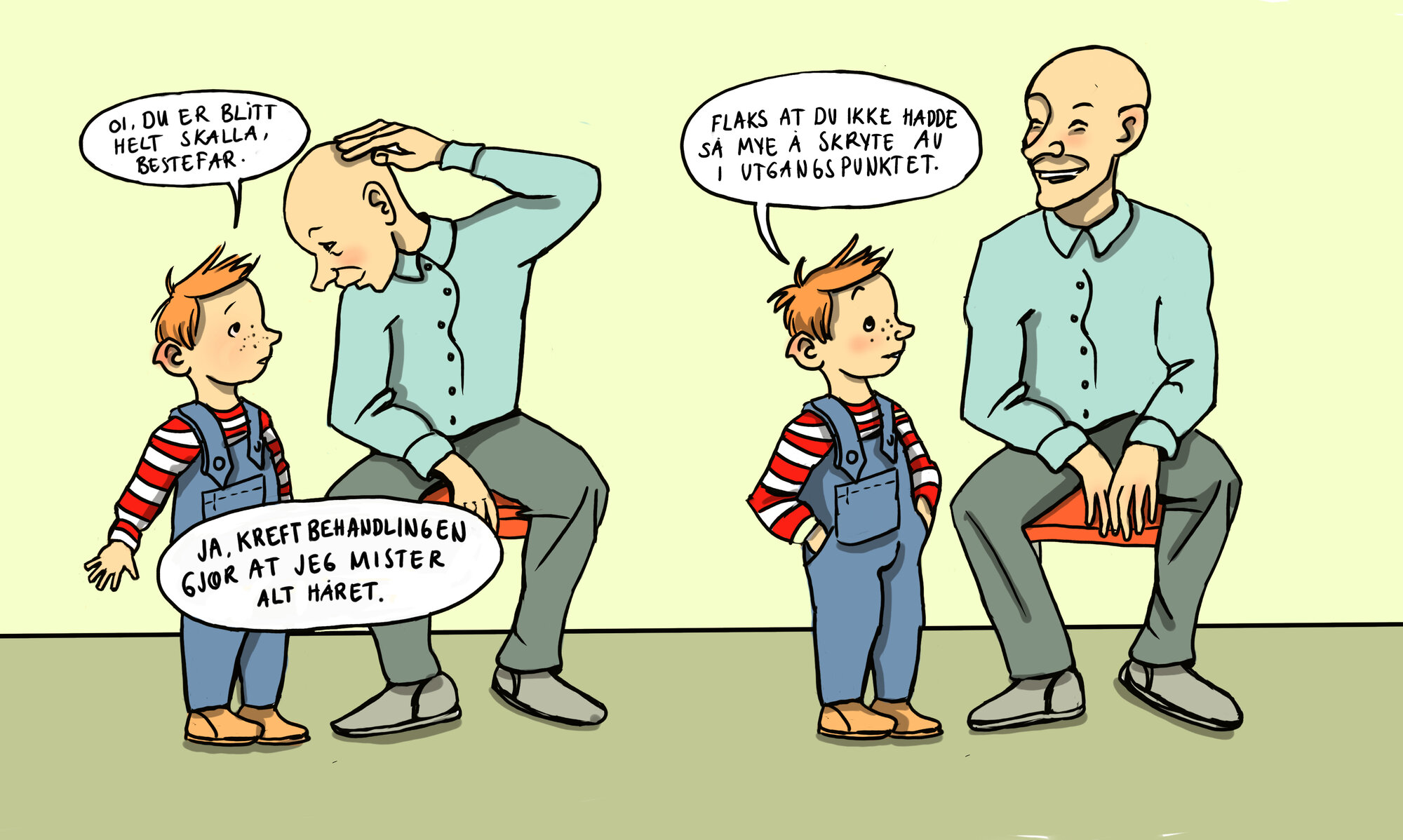Illustrasjonen viser en gutt som sier til bestefaren: "Oi, du er blitt helt skalla, bestefar.". Bestefaren svarer: "Ja, kreftbehandlingen gjør at jeg mister håret.". Gutten sier: "Flaks at du ikke hadde så mye å skryte av i utgangspunktet."