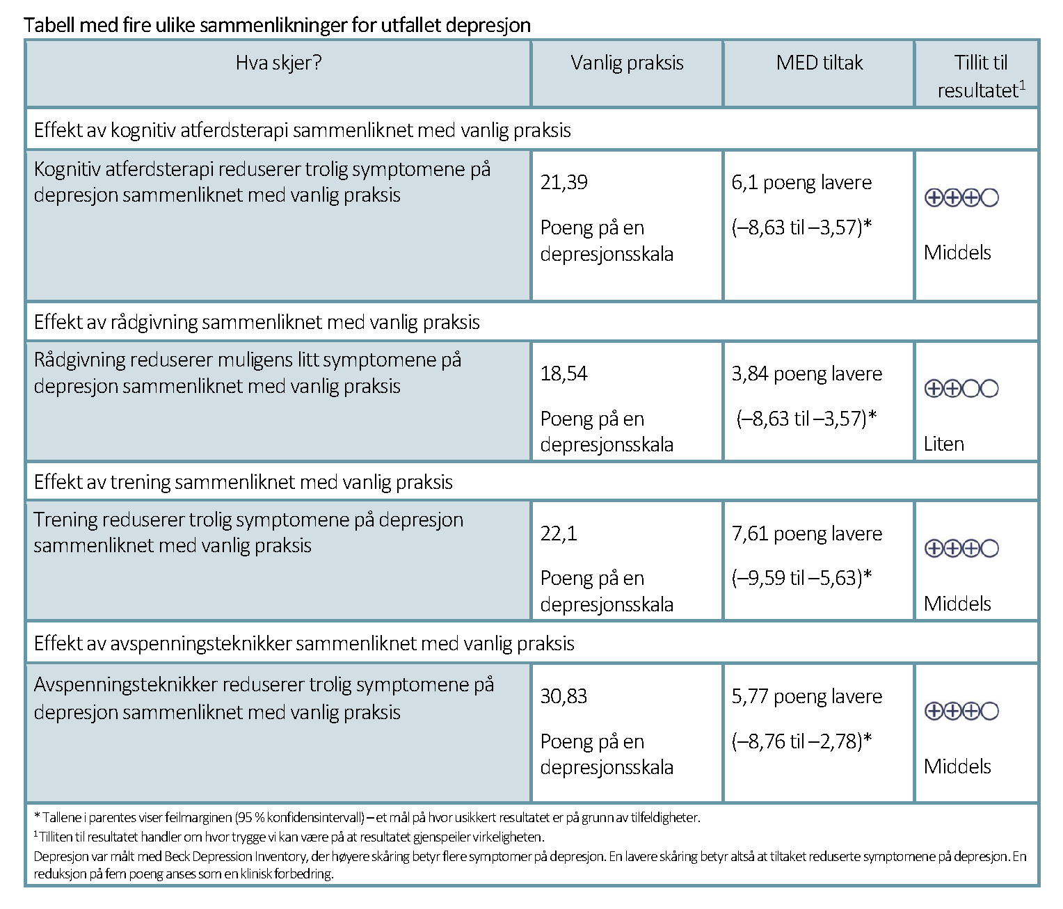 - Kognitiv atferdsterapi reduserer trolig symptomene på depresjon sammenliknet med vanlig praksis.