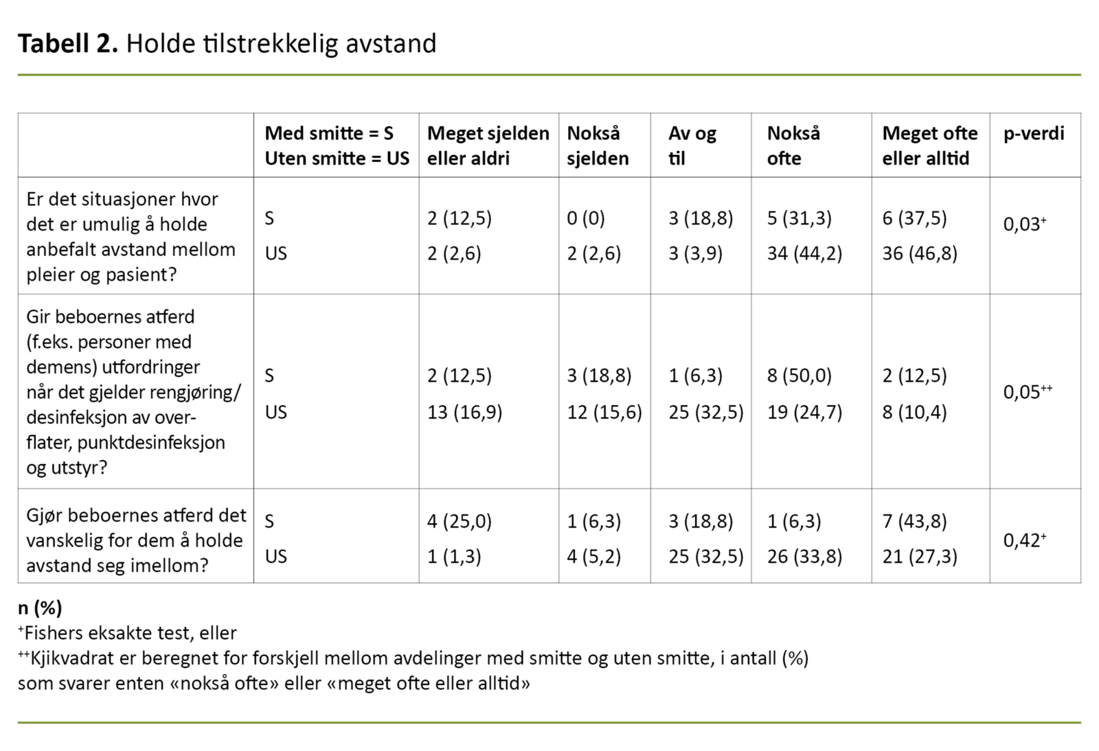 Åttien avdelinger (87 prosent) (tabell 2) oppga at det nokså ofte eller meget ofte eller alltid var umulig å holde avstand mellom pleiere og beboere i alle situasjoner. At 87 prosent i stor grad ikke klarte å overholde myndighetenes anbefaling om avstand, er et sannsynlig funn gitt at de fleste pasientene trenger fysisk hjelp.