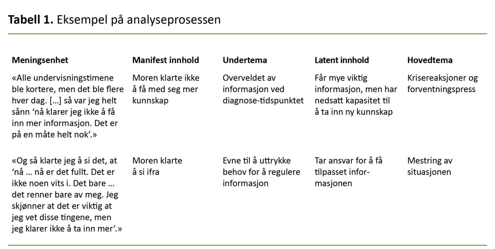 Denne tolkningsprosessen bidro til å få frem den underliggende meningen, det vil si det latente innholdet. Gjennom undertemaene og den underliggende betydningen dannet vi hovedtemaene (17, 18) (tabell 1).