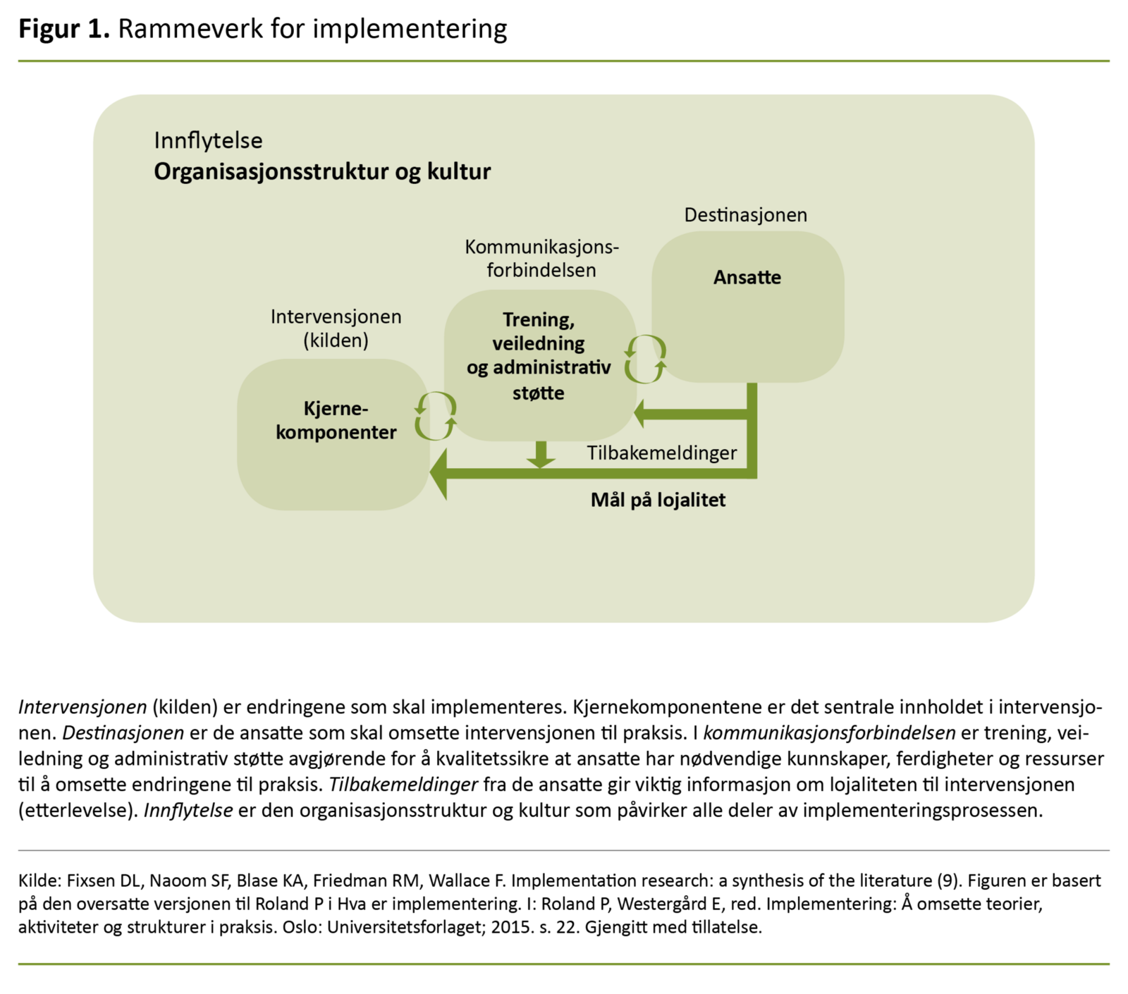 En norsk oppsummering av effektive implementeringsstrategier fra 2011 anbefaler at helsepersonell involveres mer i beslutningsprosesser (4). I Fixsen og medarbeideres implementeringsmodell er kommunikasjonsforbindelsen bindeleddet mellom retningslinjer og klinisk helsepersonell og avgjørende for å oppnå nødvendige kunnskaper og ferdigheter (figur 1) (9).