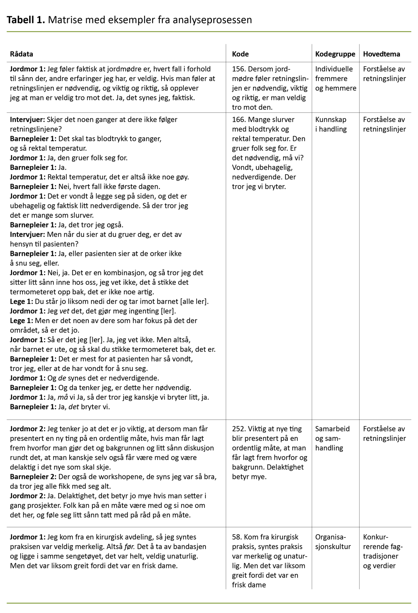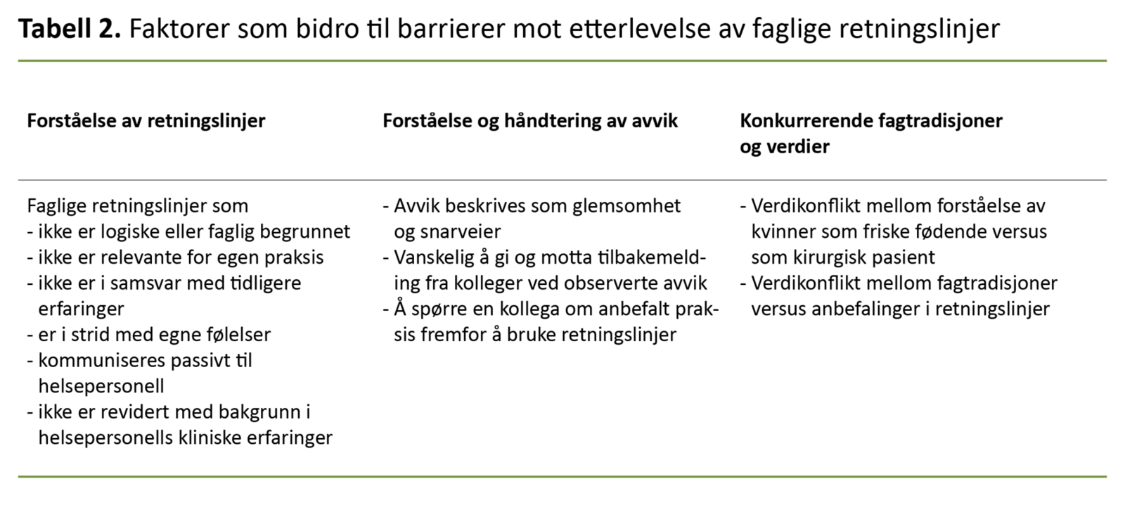 Resultat: Informantene beskrev at de syntes retningslinjene var vanskelige å etterleve hvis de ikke oppfattet dem som faglig velbegrunnet, logiske, relevante eller i samsvar med egne kliniske erfaringer og følelser. Anbefalinger som konkurrerte med avdelingens fagtradisjoner og verdier, kunne også bidra til barrierer. De forklarte ofte avvik fra retningslinjene som glemsomhet og snarveier. Informantene opplevde det som krevende å gi og motta korrigerende tilbakemeldinger fra kolleger ved observerte avvik, særlig fra kolleger med en annen yrkestilhørighet. Ved tvil om anbefalt praksis benyttet legene i hovedsak retningslinjer, mens jordmødrene og barnepleierne ofte spurte en erfaren kollega som de hadde tillit til.