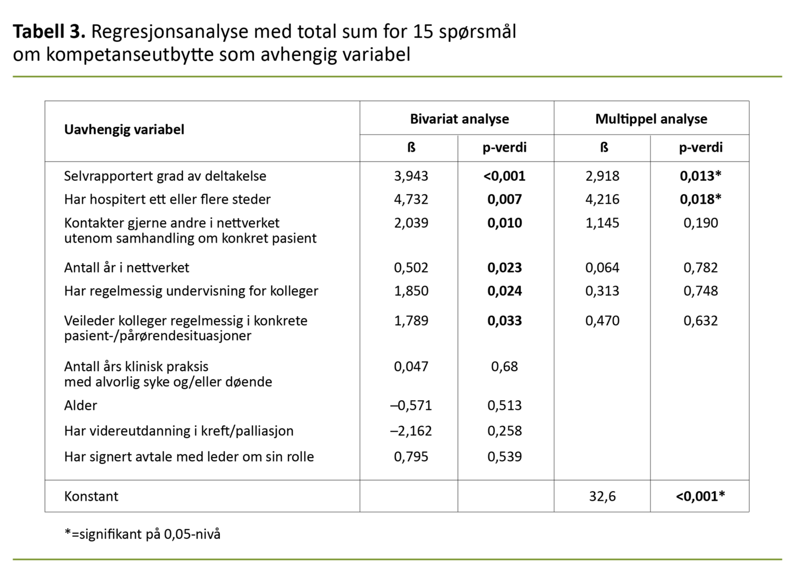 Ved multippel regresjonsanalyse var det kun hospitering og selvrapportert grad av deltakelse som viste signifikant assosiasjon med kompetanseutbyttet (tabell 3).
