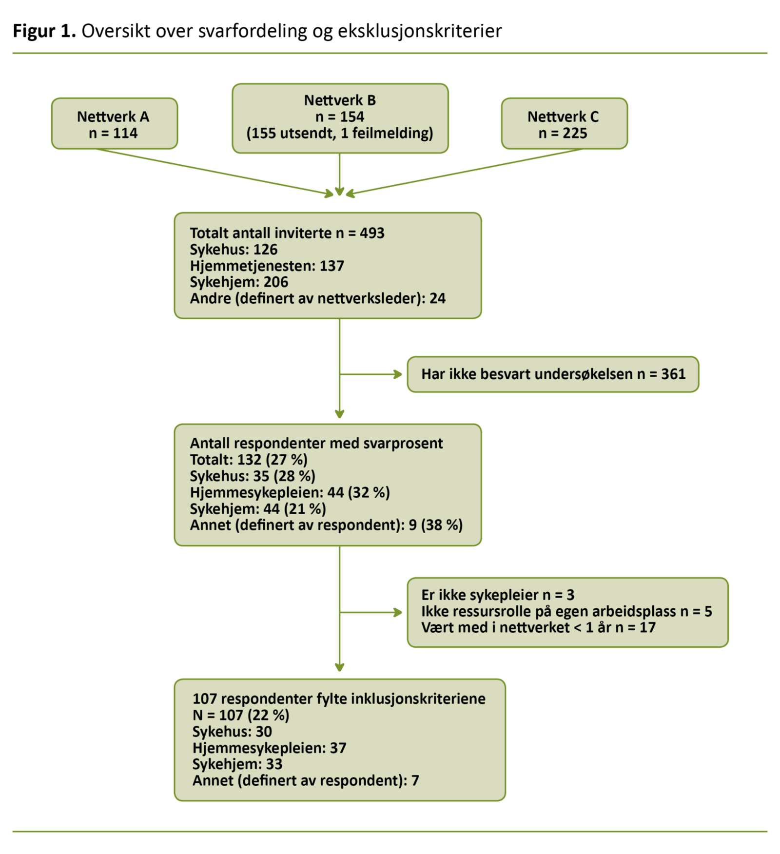 Kontinuitet og oppdaterte nettverkslister er en kjent utfordring som Sintef har påpekt (5), og det var forventet at vi ville få svar fra noen som ikke hadde rollen som ressurssykepleiere. Vi ekskluderte derfor dem som ikke var sykepleiere, eller som ikke hadde rollen som ressurssykepleier.