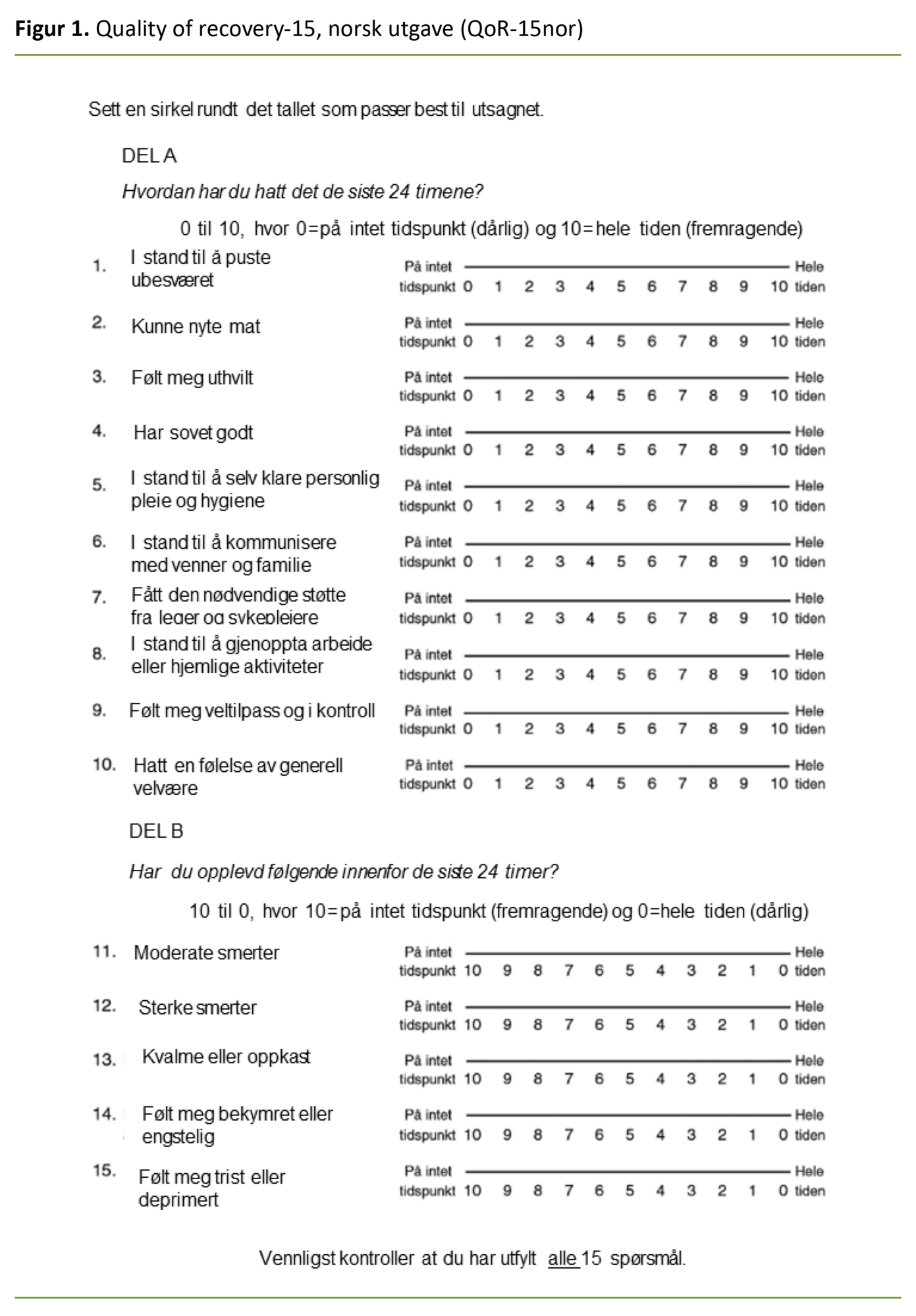 - Spørreskjemaet Quality of Recovery-15 norsk versjon (QoR-15nor) (se figur 1).