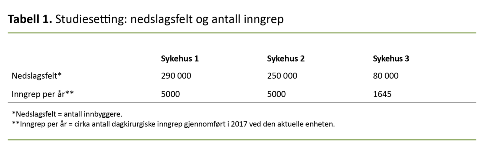 Tabell 1 gir en oversikt over sykehusenes nedslagsfelt og dagkirurgiske aktivitetsnivå per 2017.