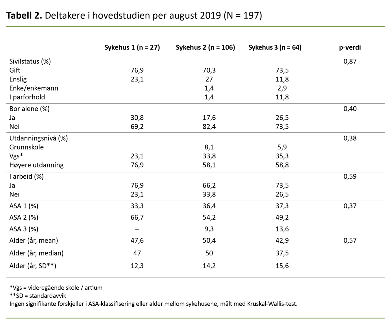 Tabellen viser at deltakerne hadde en gjennomsnittsalder fra 42,9 til 50,4 år. Flesteparten var gift og hadde høyere utdanning. Videre var det en overvekt av pasienter med ASA-klasse II. Det var ingen signifikante forskjeller mellom deltakerne ved de tre ulike sykehusene.
