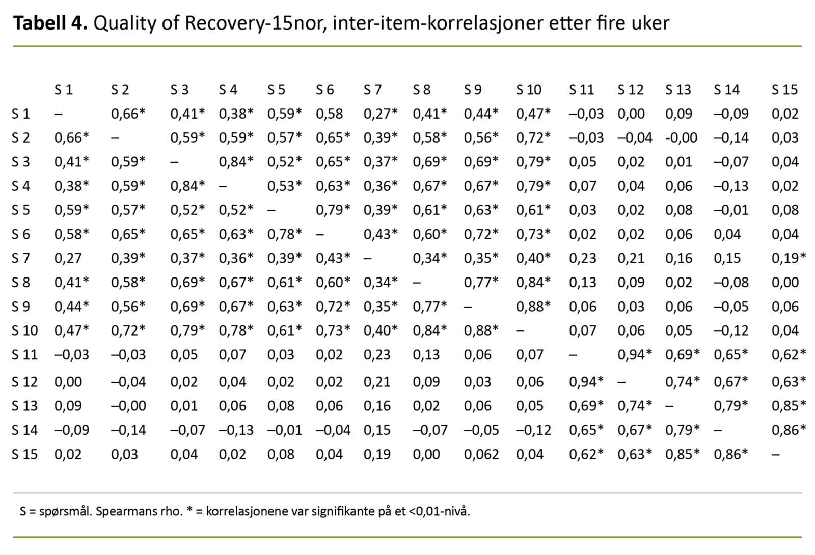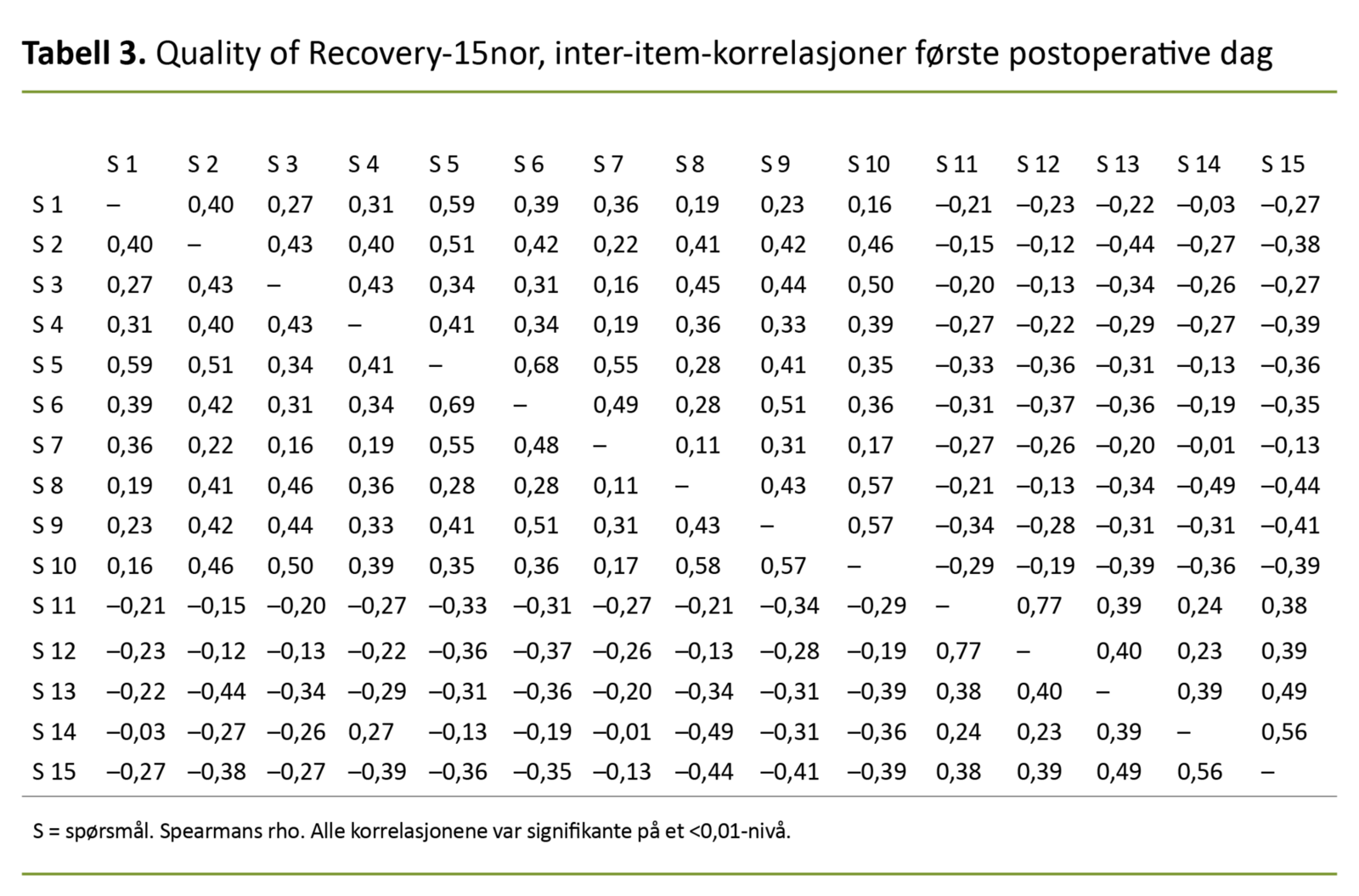 Tabell 3 og 4 viser inter-item-korrelasjoner mellom spørsmålene i QoR-15nor på henholdsvis første postoperative dag og etter fire uker.