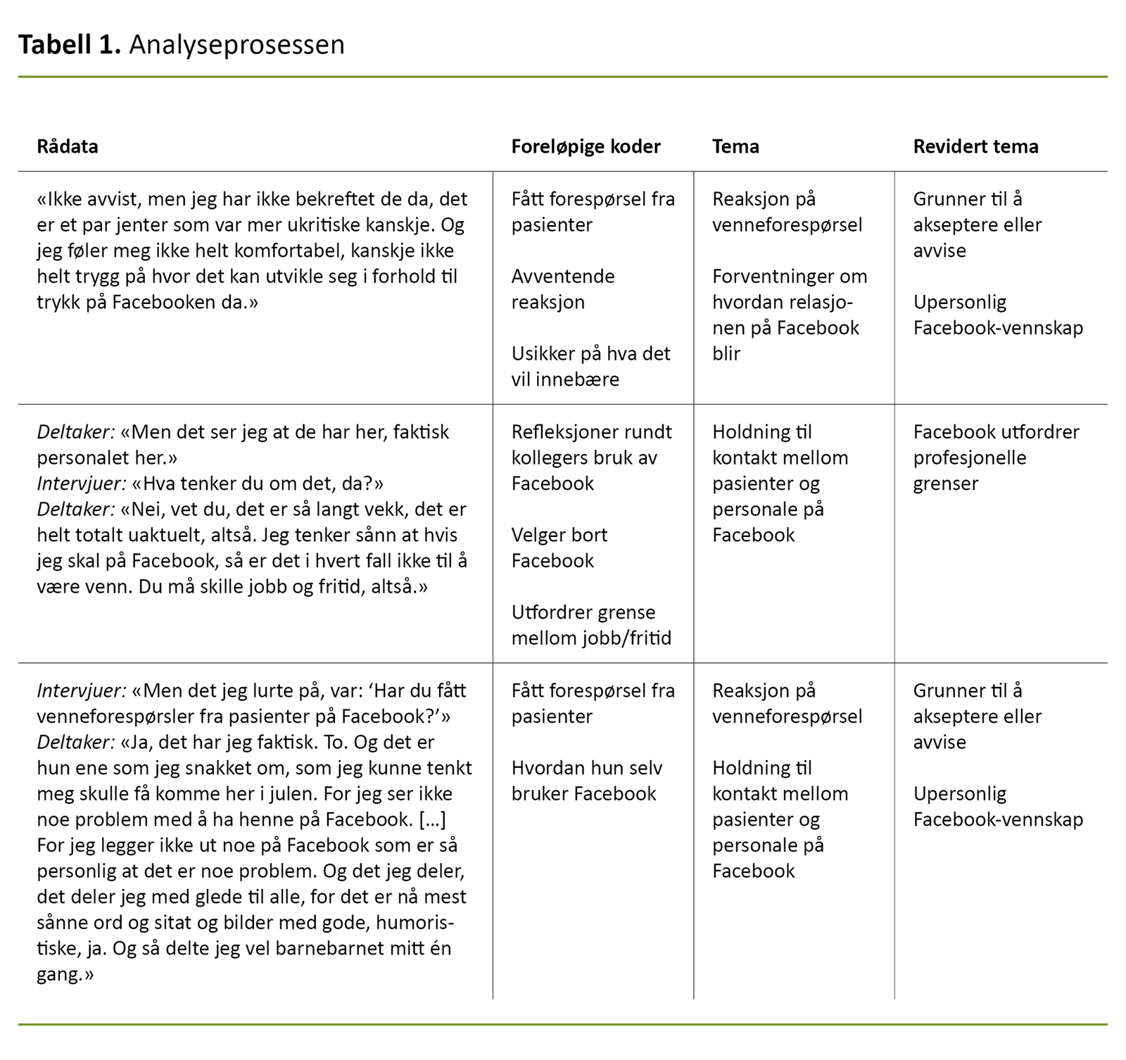 Analysen tok utgangspunkt i å beskrive sykepleiernes erfaringer med og refleksjoner om sin egen og sine kollegers kontakt med pasienter på Facebook. Deltakere som ikke selv var Facebook-brukere på tidspunktet for intervjuene, bidro med refleksjoner om det å velge bort Facebook samt om kollegers bruk.