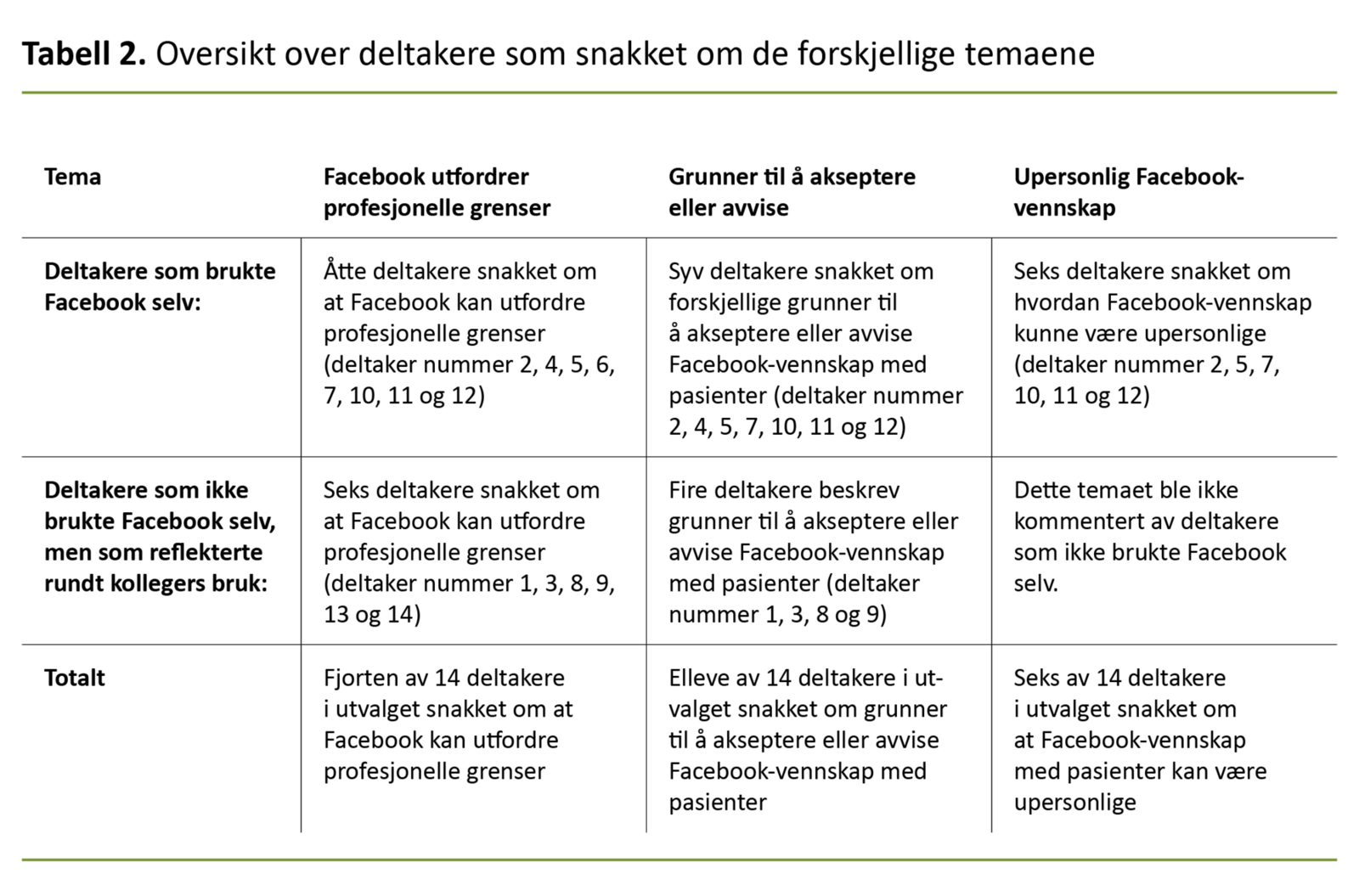 Av 14 sykepleiere i utvalget brukte åtte Facebook. Alle av disse åtte hadde fått venneforespørsler fra pasienter, hvorav fem valgte å akseptere noen venneforespørsler. Både sykepleiere som brukte, og som ikke brukte Facebook, reflekterte over at Facebook kunne utfordre profesjonelle grenser i sykepleier–pasient-relasjonen.