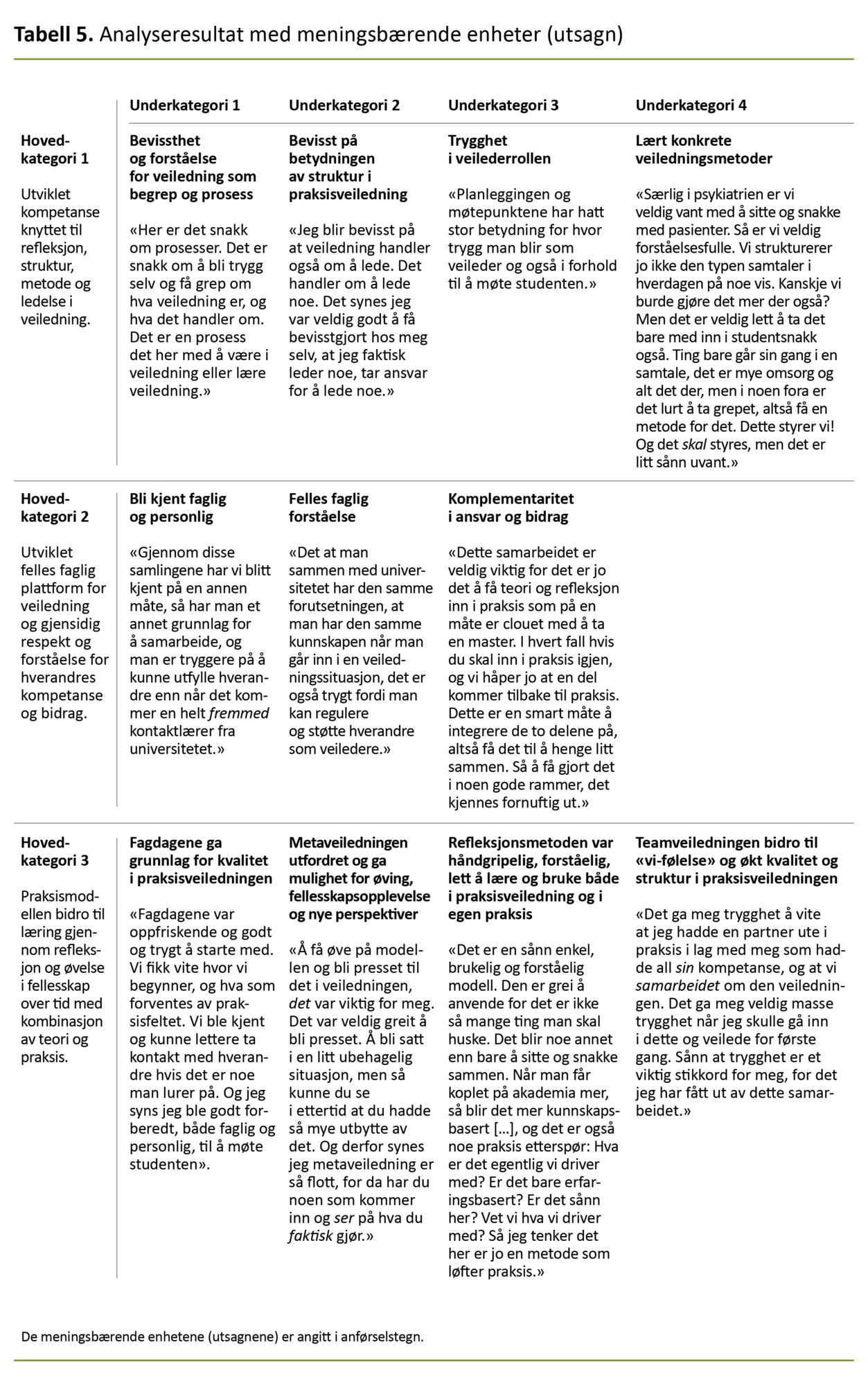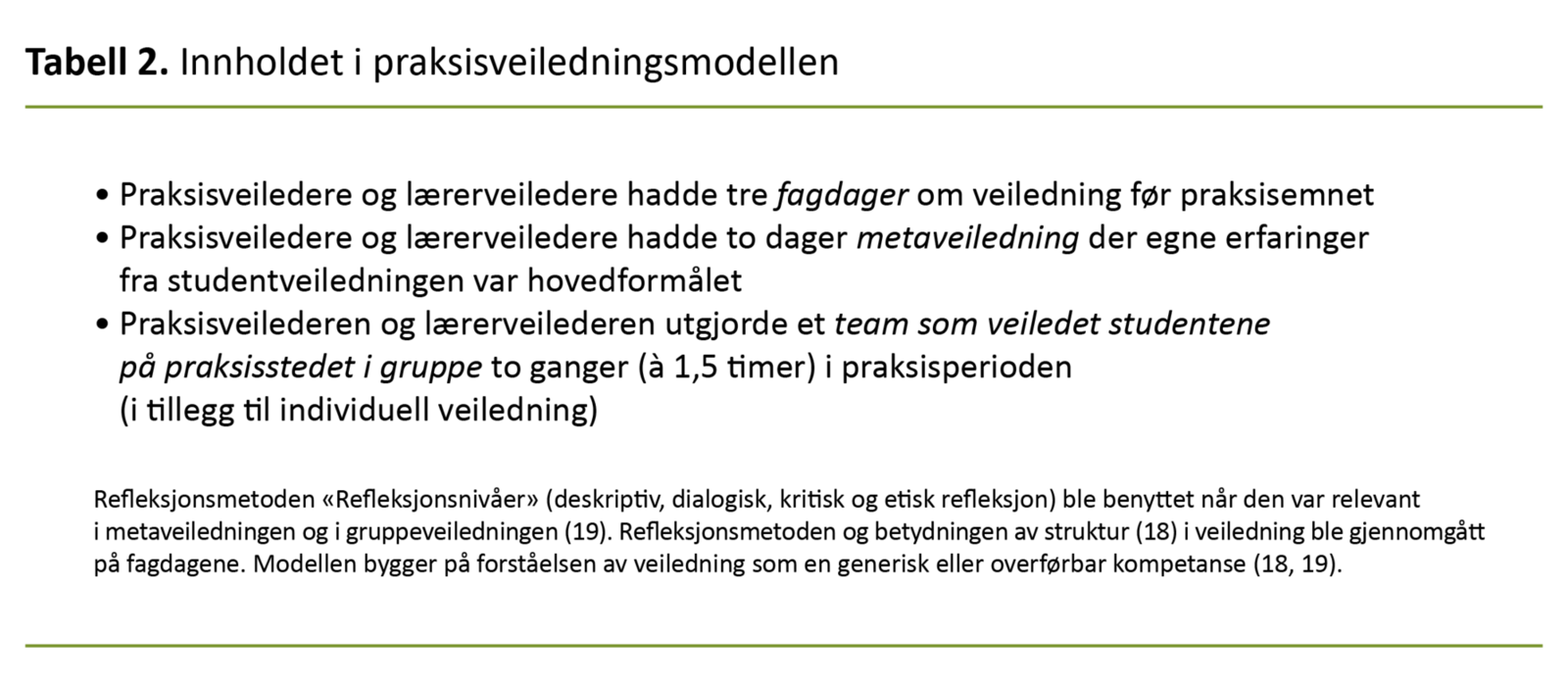 Resultat: Analysen resulterte i tre hovedkategorier: 1) utvikling av kompetanse knyttet til refleksjon, struktur, metode og ledelse i veiledning, 2) utvikling av samarbeid gjennom felles faglig plattform for veiledning, gjensidig respekt og forståelse for hverandres kompetanse og bidrag, og 3) praksismodellen bidro til læring og bevisstgjøring gjennom refleksjon og øving i fellesskap over tid med kombinasjon av teori og praksis