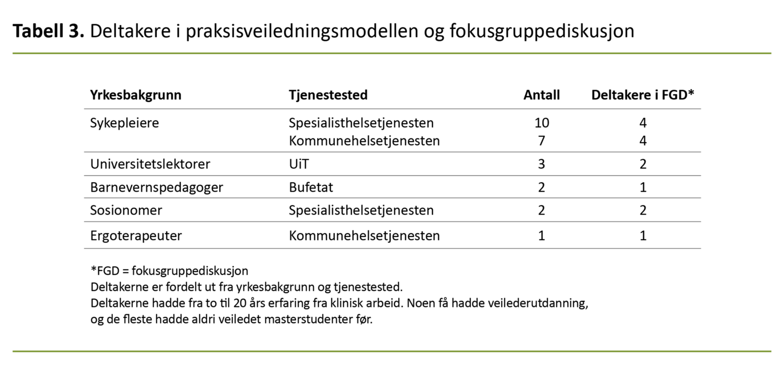 Tabell 3. Deltakere i praksisveiledningsmodellen og fokusgruppediskusjon