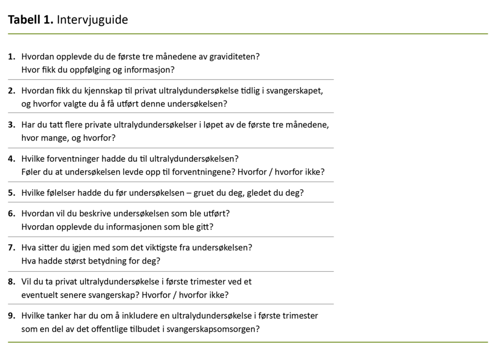Vi samlet inn datamaterialet gjennom kvalitative intervjuer. I forkant av intervjuene utarbeidet vi en halvstrukturert intervjuguide som inneholdt spørsmål som kunne gi en dypere forståelse av hvorfor gravide kvinner på eget initiativ ønsket å få utført ultralyd i første trimester (tabell 1).