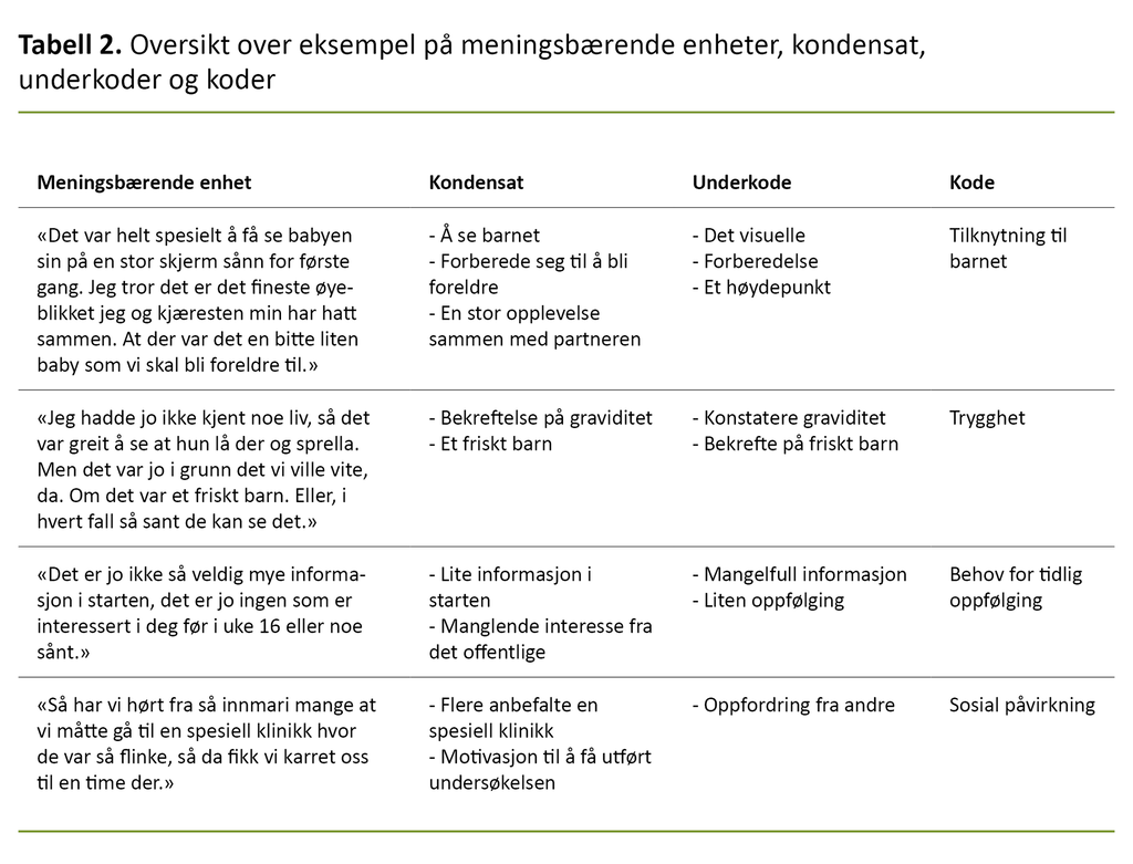 I trinn to gikk vi systematisk igjennom materialet og identifiserte meningsbærende enheter som gjenspeilet de gravide kvinnenes erfaringer og opplevelser. De meningsbærende enhetene ble videre sortert inn i grupper og kodet.