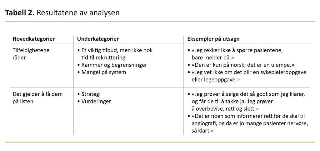 Informantene uttrykte at de benyttet ulike strategier i rekrutteringen. Strategier som de brukte, var tilpasset kommunikasjon, positiv omtale av tilbudet eller å få legen til å snakke med pasientene om tilbudet. En sa: «Jeg prøver å selge det så godt som jeg klarer, og får dem til å takke ja. Jeg prøver å overbevise, rett og slett.»