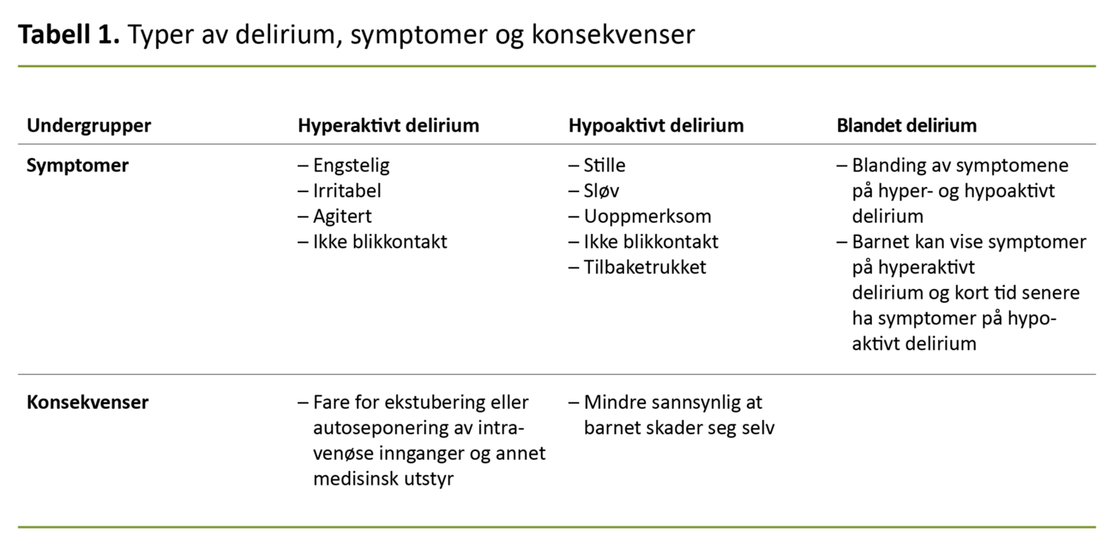 Delirium deles opp i tre grupper (tabell 1) (9, 12). På bakgrunn av disse diagnosekriteriene er det videreutviklet kartleggingsverktøy for voksne (13), som igjen er modifisert for den aktuelle aldersgruppen, og som kan støtte daglig observasjon av barnets tilstand.