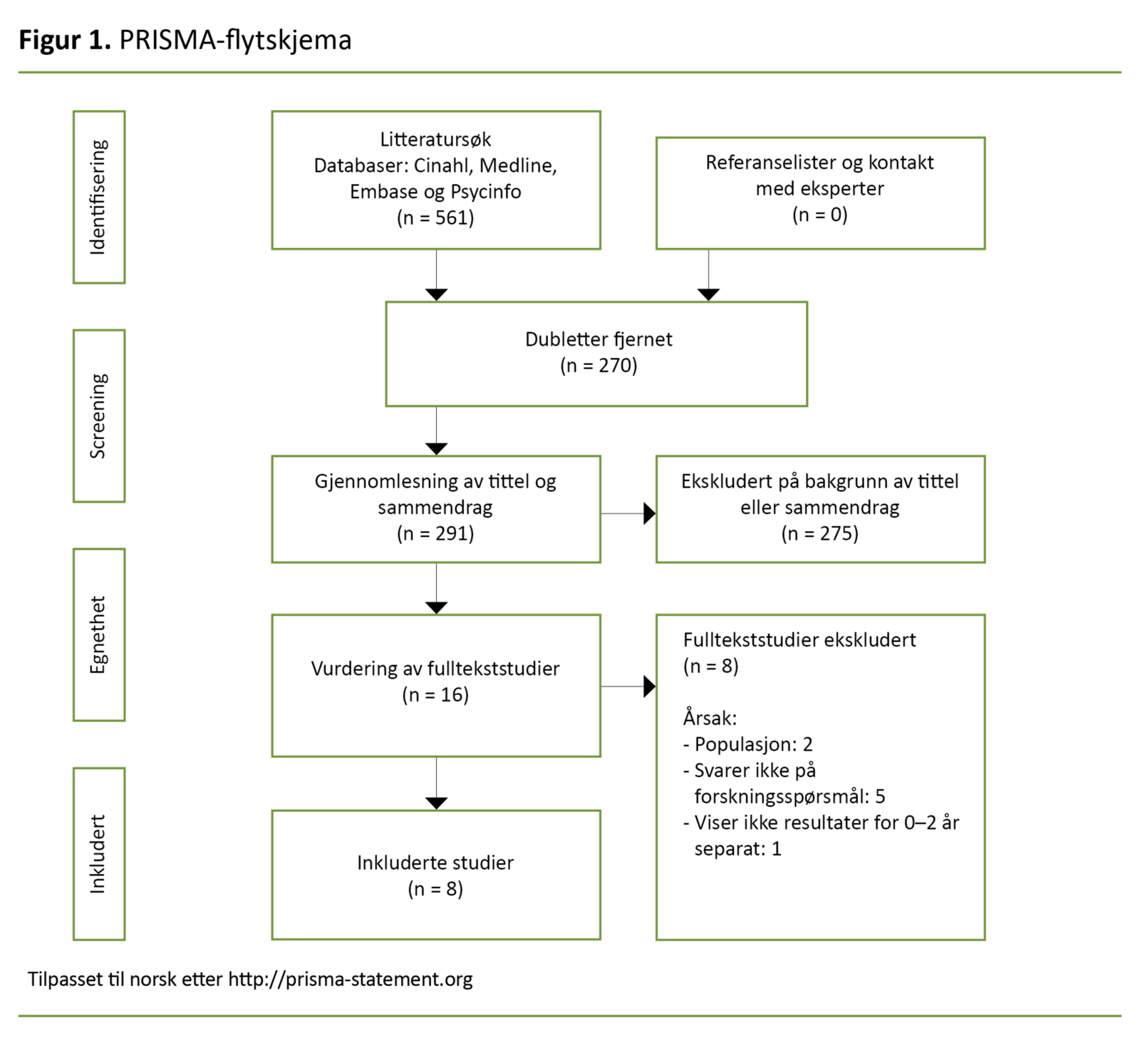 Vi avgrenset resultatlistene til artikler med engelsk og skandinavisk språk, uten begrensninger i årstall eller studiedesign. Vi valgte aldersgruppen 0–2 år, da artiklene ofte ikke presenterte resultater fra spedbarn separat, og at det derfor ikke var mulig å ekstrahere nok data til en oversiktsartikkel spesifikt på spedbarn.