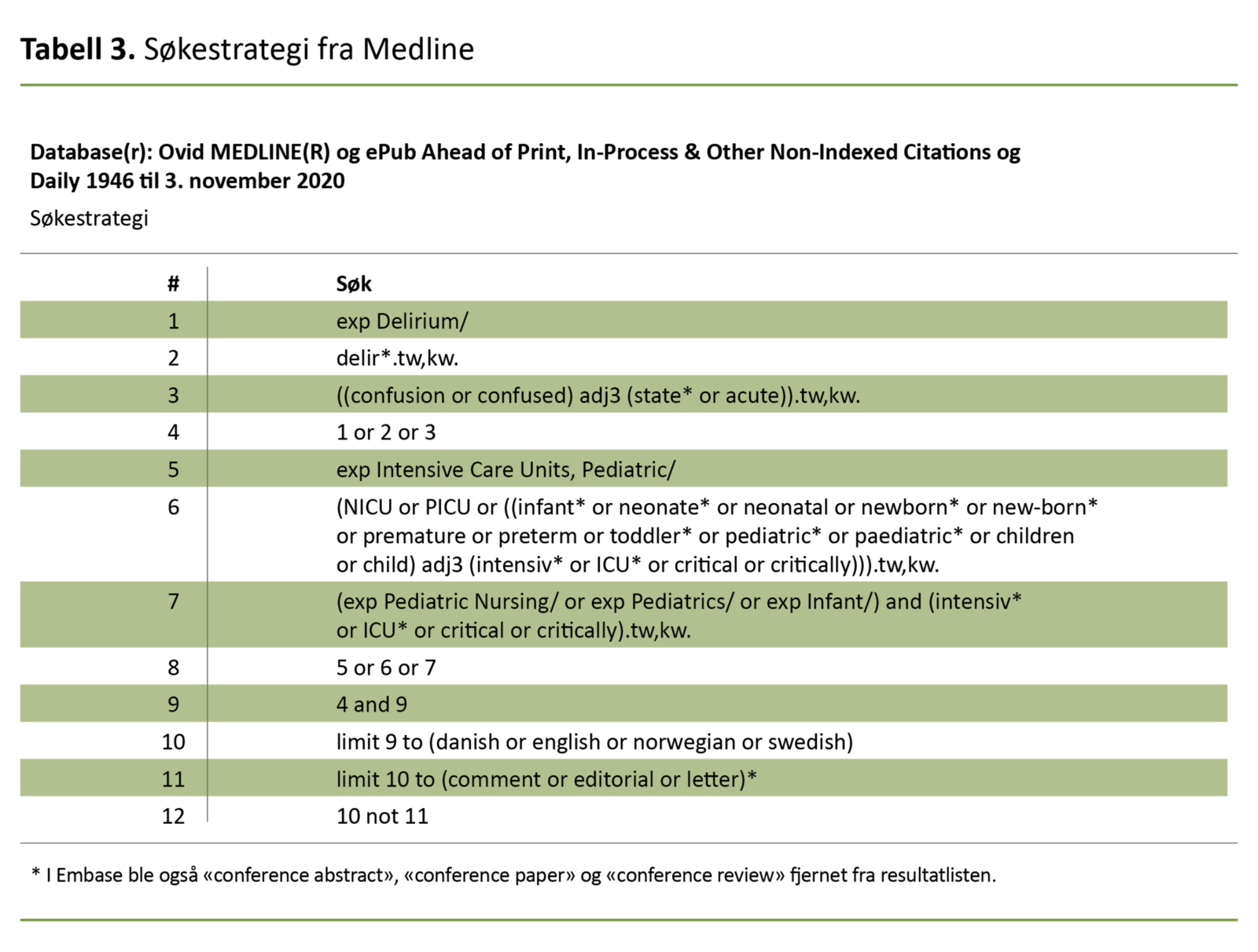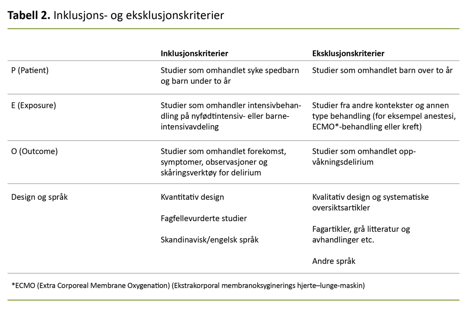 Problemstilling og inklusjons- og eksklusjonskriterier (tabell 2) ble utarbeidet ved hjelp av et PEO-skjema (Patient – pasient, Exposure – eksponering og Outcome – utfall) (8). Pasienten var barn fra 0–2 år, eksponeringen var intensivbehandling og innlagt på barneintensiv- eller nyfødtintensivavdeing, og utfallet delirium. Spesialbibliotekaren ved Lovisenberg diakonale høgskole (LDH) utarbeidet en søkestrategi (tabell 3) med en kombinasjon av emneord og tekstord for å favne tilgjengelig datamateriale.