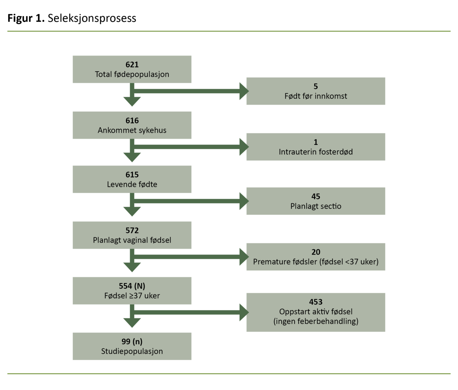 I 2018 var fødselsantallet ved Ullevål sykehus 6861, noe som utgjorde 12,5 prosent av alle fødsler i Norge (55 072) (15). Av totalt 621 fødsler i studieperioden ble 69 fødsler ekskludert (figur 1).
