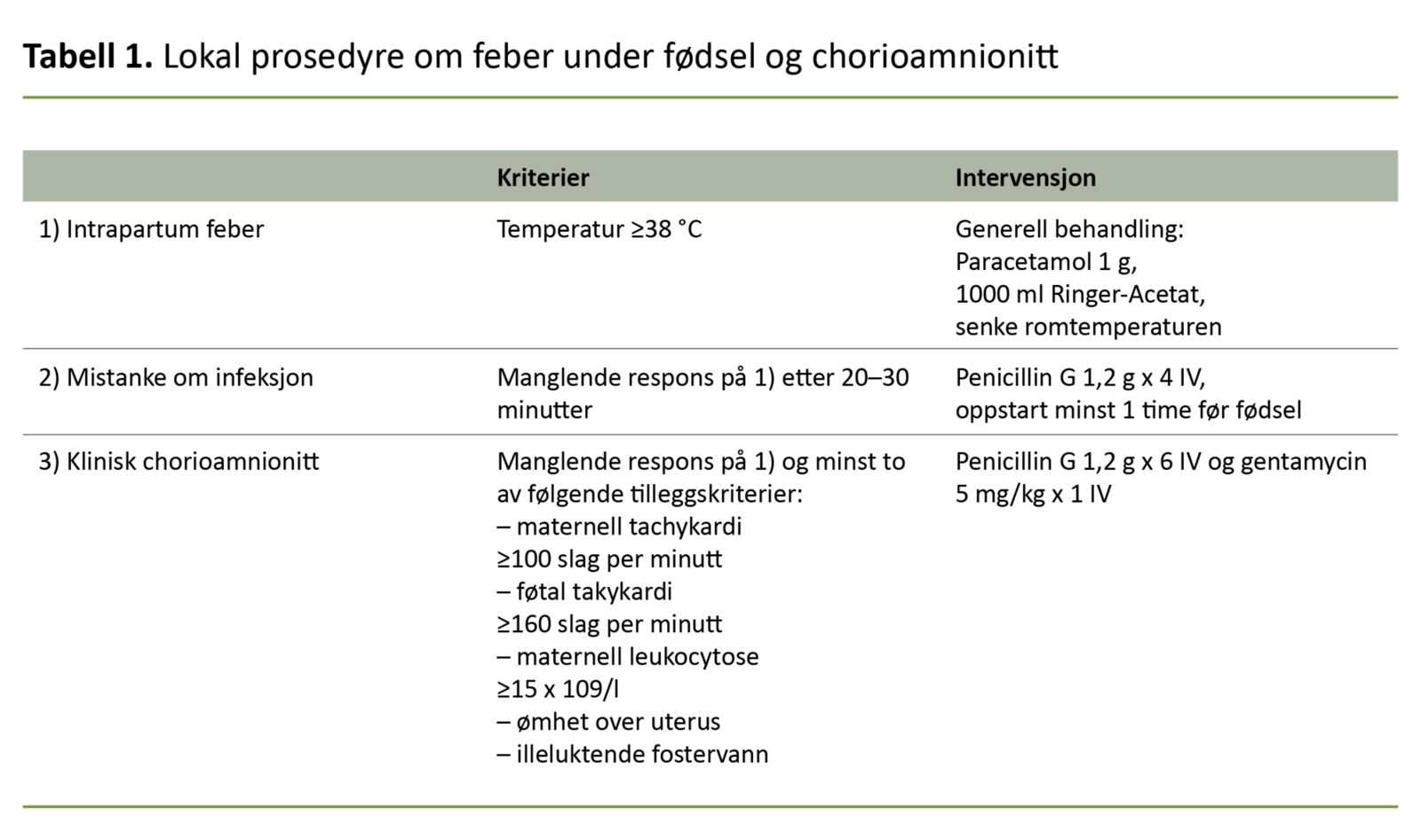Resultat: Feber under fødsel (intrapartum feber) var registrert hos 67 av 552 pasienter (12 prosent). 99 pasienter (18 prosent) mottok behandling med feberreduserende medikamenter og/eller antibiotika grunnet feber. Av disse fikk 53 penicillin (54 prosent) grunnet mistanke om infeksjon. Kriteriene etter gjeldende prosedyre for profylaktisk antibiotikabehandling ble oppfylt hos 38 av de 53 pasientene som fikk penicillin (72 prosent). Penicillin i kombinasjon med gentamycin ble gitt til 21 av 99 pasienter (21 prosent) med indikasjon klinisk chorioamnionitt (betennelse i føtale membraner). Av disse 21 pasientene var det 15 (71 prosent) som oppfylte kriteriene for behandling.