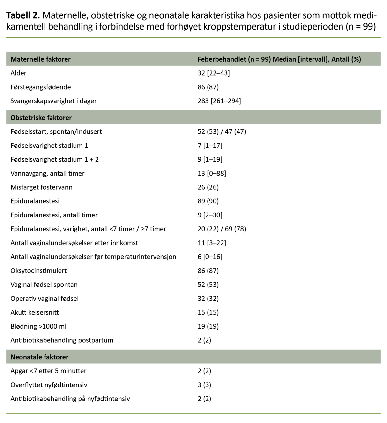 Maternelle, obstetriske og neonatale karakteristika hos pasienter som mottok medikamentell behandling i forbindelse med forhøyet kroppstemperatur (n = 99), er presentert i tabell 2.