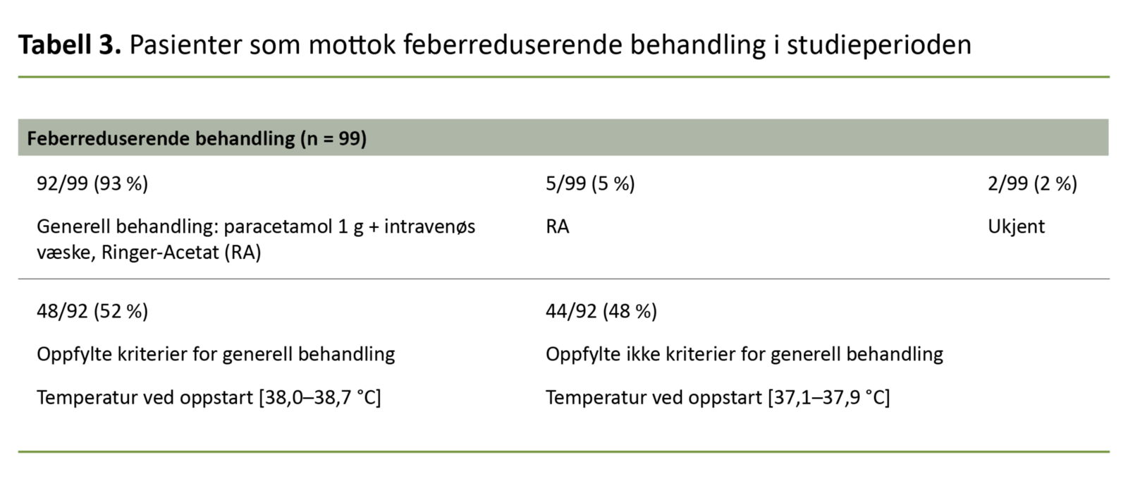 Generell behandling av feber (feberreduserende behandling: paracetamol kombinert med intravenøs væske) ble gitt til 92 av 99 pasienter (93 prosent) (tabell 3). Hos de resterende sju kvinnene var det dokumentert at fem fikk intravenøs væske med feber som indikasjon uten at paracetamol var dokumentert.
