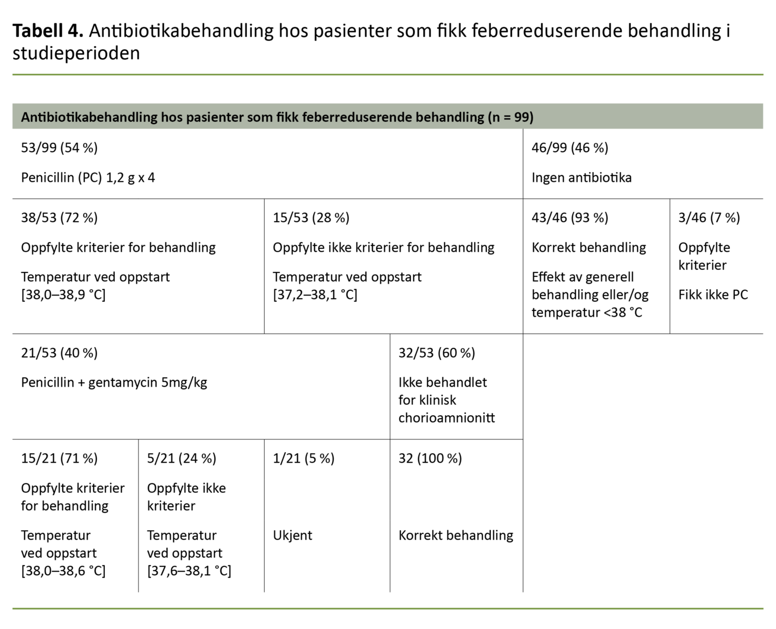 Penicillin ble gitt til 53 av 99 pasienter (54 prosent) ved mistanke om infeksjon (tabell 4). Av disse oppfylte 38 av 53 (72 prosent) kriteriene. Av de 15 pasientene som ikke oppfylte kriteriene, ble det hos fem startet med penicillin før effekten av generell behandling ble vurdert.