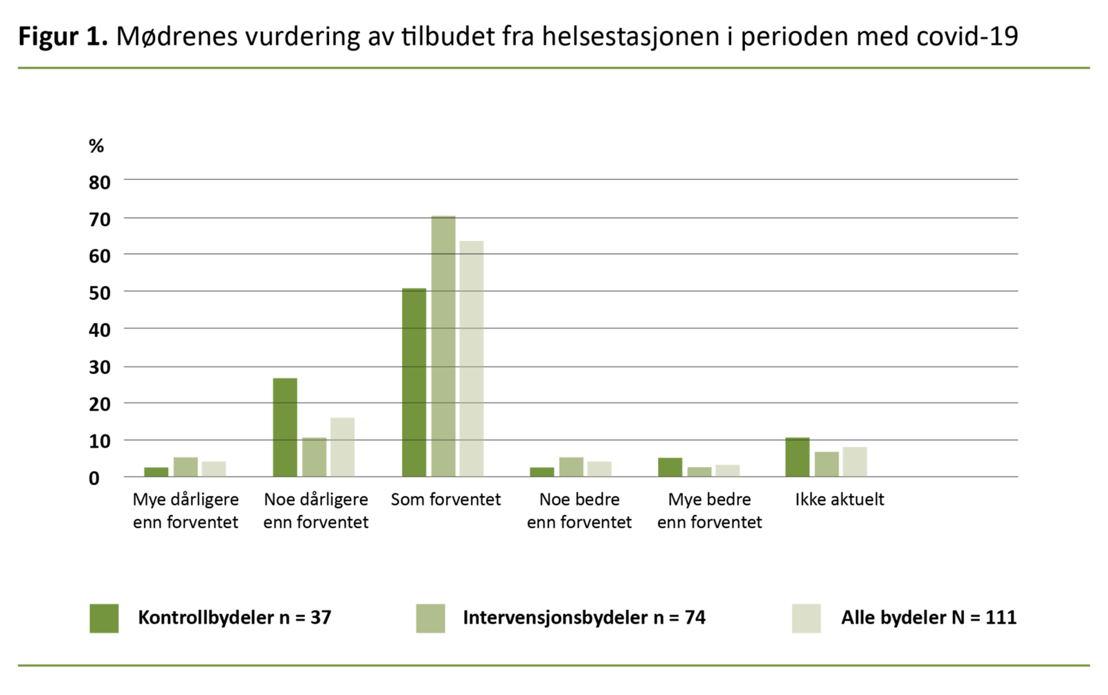 Konklusjon: En stor andel av mødrene hadde vært i kontakt med helsestasjonen i perioden, og signifikant flere i intervensjonsbydelene enn i kontrollbydelene. Mer enn en tredjedel av mødrene rapporterte at de fikk utilstrekkelig informasjon om endringer i tjenestetilbudet i perioden. Mødrene foretrakk det ordinære tilbudet, men så likevel ut til å tilpasse seg endringene og det tilbudet som ble gitt.
