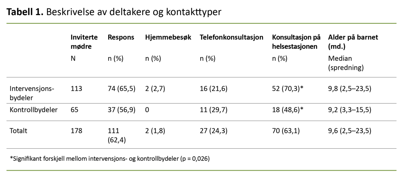 Syttiåtte mødre (70 prosent) hadde vært i kontakt med helsestasjonen en eller flere ganger. I intervensjonsbydelene hadde 57 mødre (77 prosent) vært i kontakt med helsestasjonen, sammenliknet med 21 (57 prosent) i kontrollbydelene (p = 0,028). Tabell 1 viser hvor mange ganger hver av de tre ulike kontaktformene hjemmebesøk, telefonkontakt og konsultasjon på helsestasjonen ble brukt av mødrene.