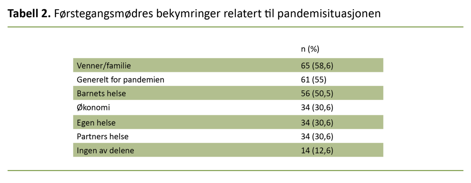 Tabell 2. Førstegangsmødres bekymringer relatert til pandemisituasjonen