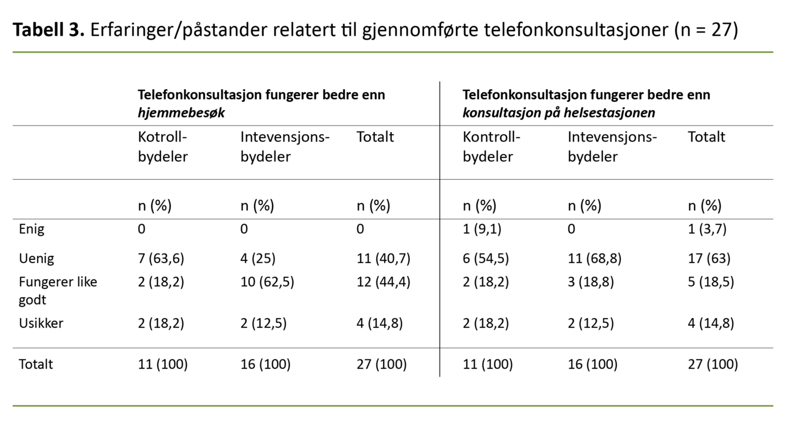 Tabell 3. Erfaringer/påstander relatert til gjennomførte telefonkonsultasjoner (n = 27)