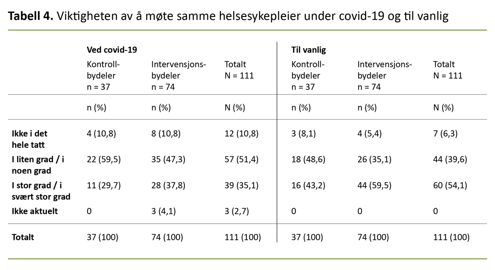 Tabell 4. Viktigheten av å møte samme helsesykepleier under covid-19 og til vanlig