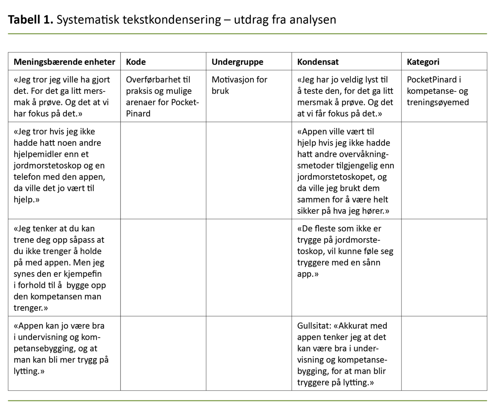 Vi tok opp intervjuet på lydbånd med appen Nettskjema-diktafon, som sørger for en sikker lagring av data i forskningsarbeid (13). Senere ble intervjuet transkribert til 23 dataskrevne sider. Vi benyttet Malteruds systematiske tekstkondensering til å gjennomføre analysearbeidet (12, 14).