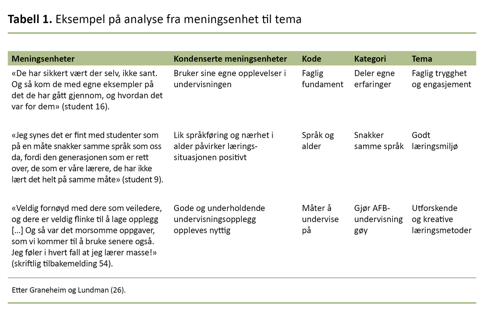 Vi arbeidet med koder, kategorier og tema og presenterte det deretter for hele forskergruppen. De kom med innspill, som vi brukte til å revidere analysen. Dette ble gjort i flere omganger frem til vi oppnådde konsensus. Tabell 1 viser en illustrasjon av analysearbeidet.