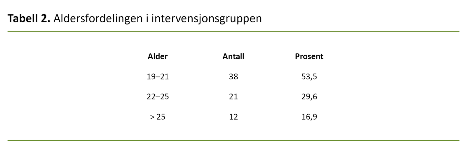 Av de 71 studentene som deltok i intervensjonen, var 66 kvinner (93 prosent) og 5 menn (7 prosent). Grunnet en skjev kjønnsfordeling i intervensjonsgruppen sammenliknet med hele 2017-kullet, der 13 prosent var menn, inkluderte vi fire menn i fokusgruppeintervjuene. Av de 22 deltakerne i fokusgruppene er derfor 18 prosent menn. Studentenes alder varierte fra 19–32 år, med de fleste rundt 20–21 år (tabell 2).