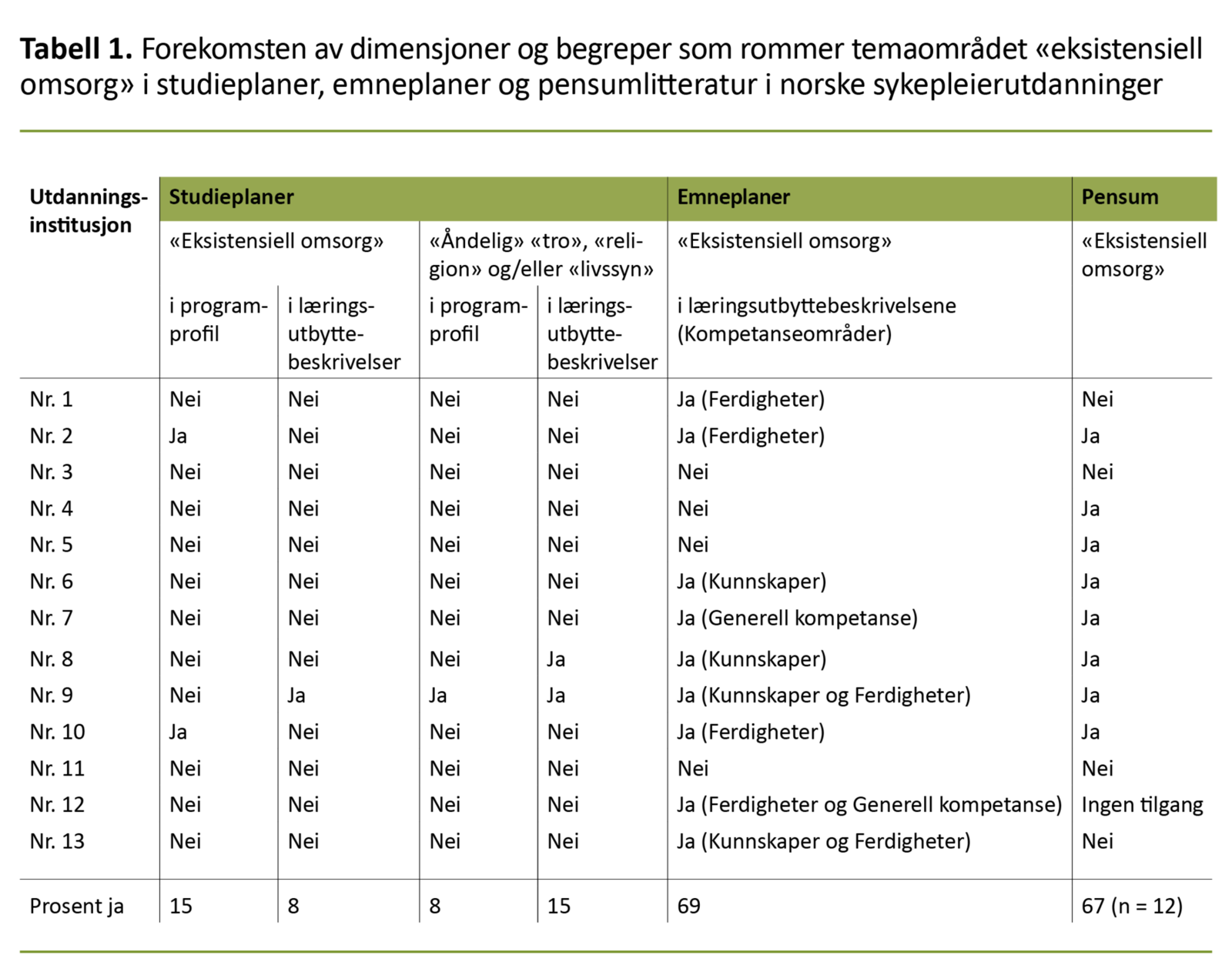 Eksistensiell omsorg var tematisert i ni av de tretten utdanningene (69 prosent) (tabell 1). Åtte utdanninger (67 prosent) hadde innarbeidet temaet «eksistensiell omsorg» og/eller «åndelig omsorg» i pensumlistene, mens en langt lavere andel hadde innarbeidet temaet i sine studieplaner (15 prosent) og læringsutbyttebeskrivelser (8 prosent).