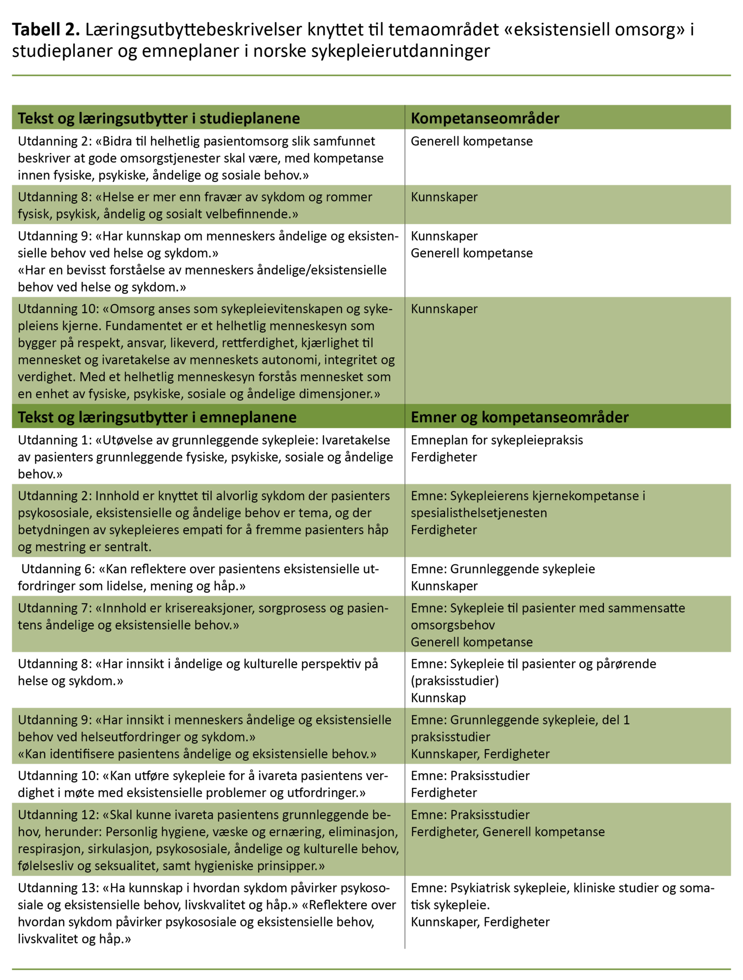 Konklusjon: Eksistensiell omsorg er godt integrert i studieplaner, emneplaner og pensumlister i norsk sykepleierutdanning. Læringsutbyttebeskrivelsene kan likevel bli enda mer presise og etterprøvbare. Kunnskaps- og ferdighetsdimensjonen i kompetansekravene bør også likestilles. Dette er det rom for i de nye nasjonale retningslinjene for sykepleierutdanningen, som gir enda tydeligere signaler om at eksistensiell omsorg skal integreres i utdanningen.