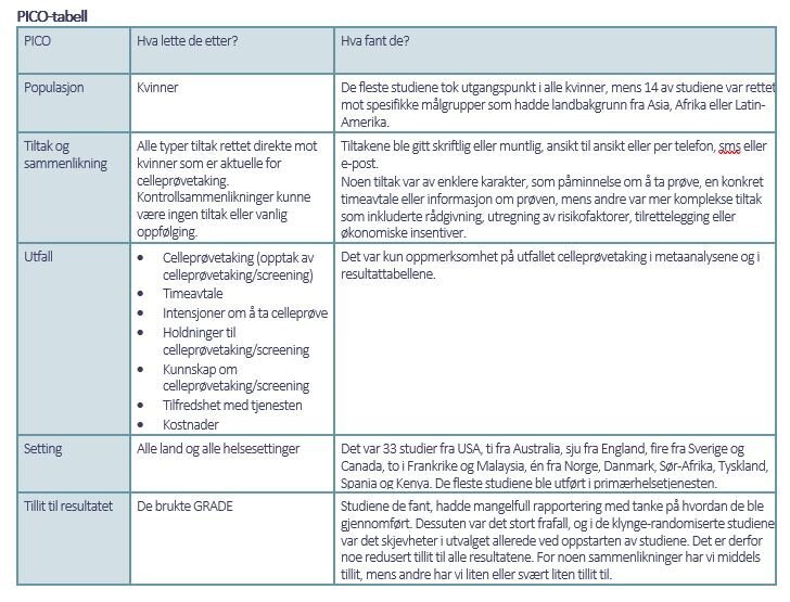 I systematiske oversikter samles og vurderes tilgjengelig forskning. I denne systematiske Cochrane-oversikten var spørsmålet som følger: «Hvilke tiltak kan få flere kvinner til å ta celleprøver?»