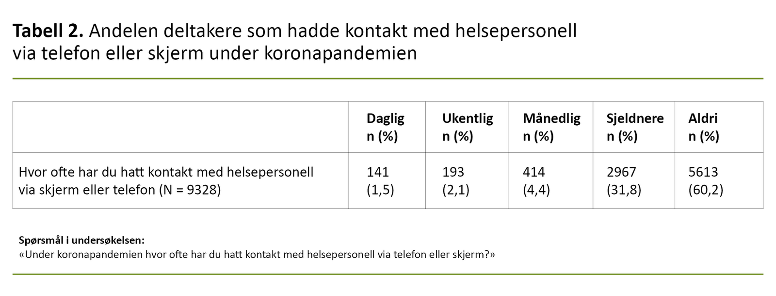 Totalt 3,6 prosent rapporterte om daglig eller ukentlig kontakt med helsepersonell via skjerm eller telefon, 4,4 prosent hadde månedlig kontakt, mens de øvrige 92,0 prosentene rapporterte om at de sjeldnere eller aldri hadde kontakt med helsepersonell via slike hjelpemidler (tabell 2).