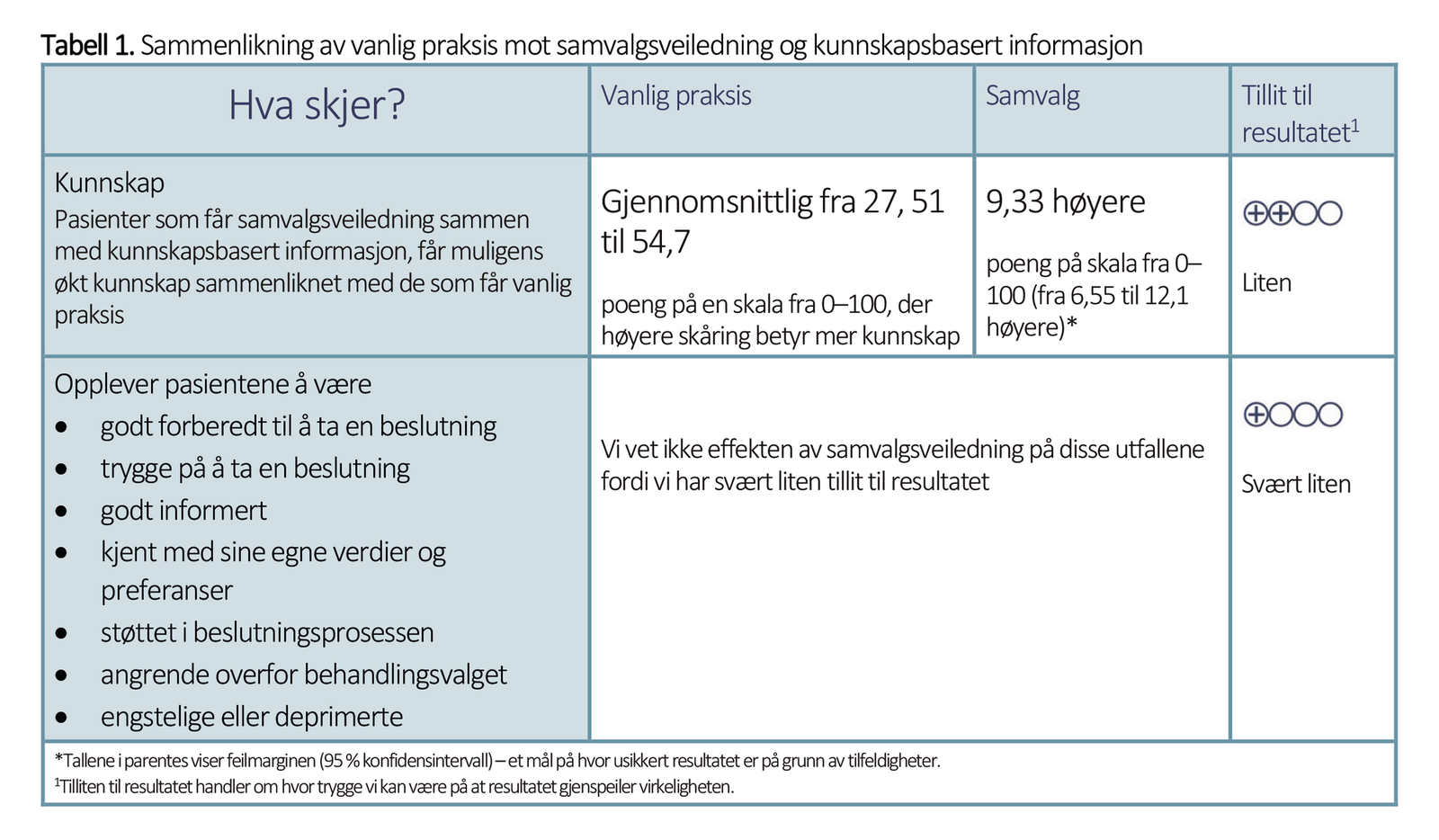 Forskningen om samvalgsveiledning og kunnskapsbasert informasjon sammenliknet med vanlig praksis viser at samvalg