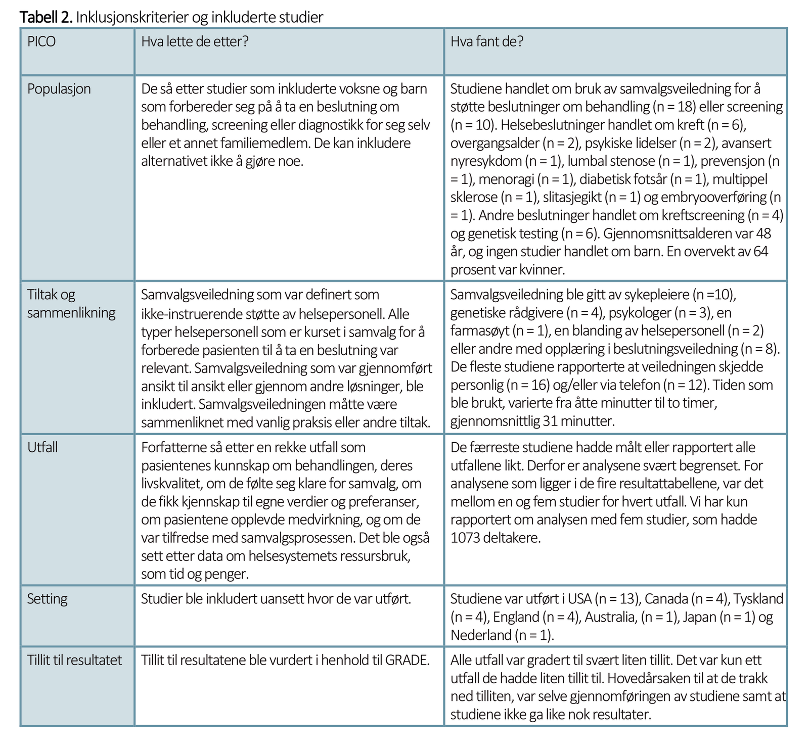 Oversikten så på effektene av hvor godt pasienten hadde fått forberedt seg til helsebeslutningen, kunnskap om pasientens preferanser, trygghet i å ta beslutning sammen med helsepersonell, kunnskap om behandlingens forventede positive og negative effekter og pasientens følelse av å være godt informert.