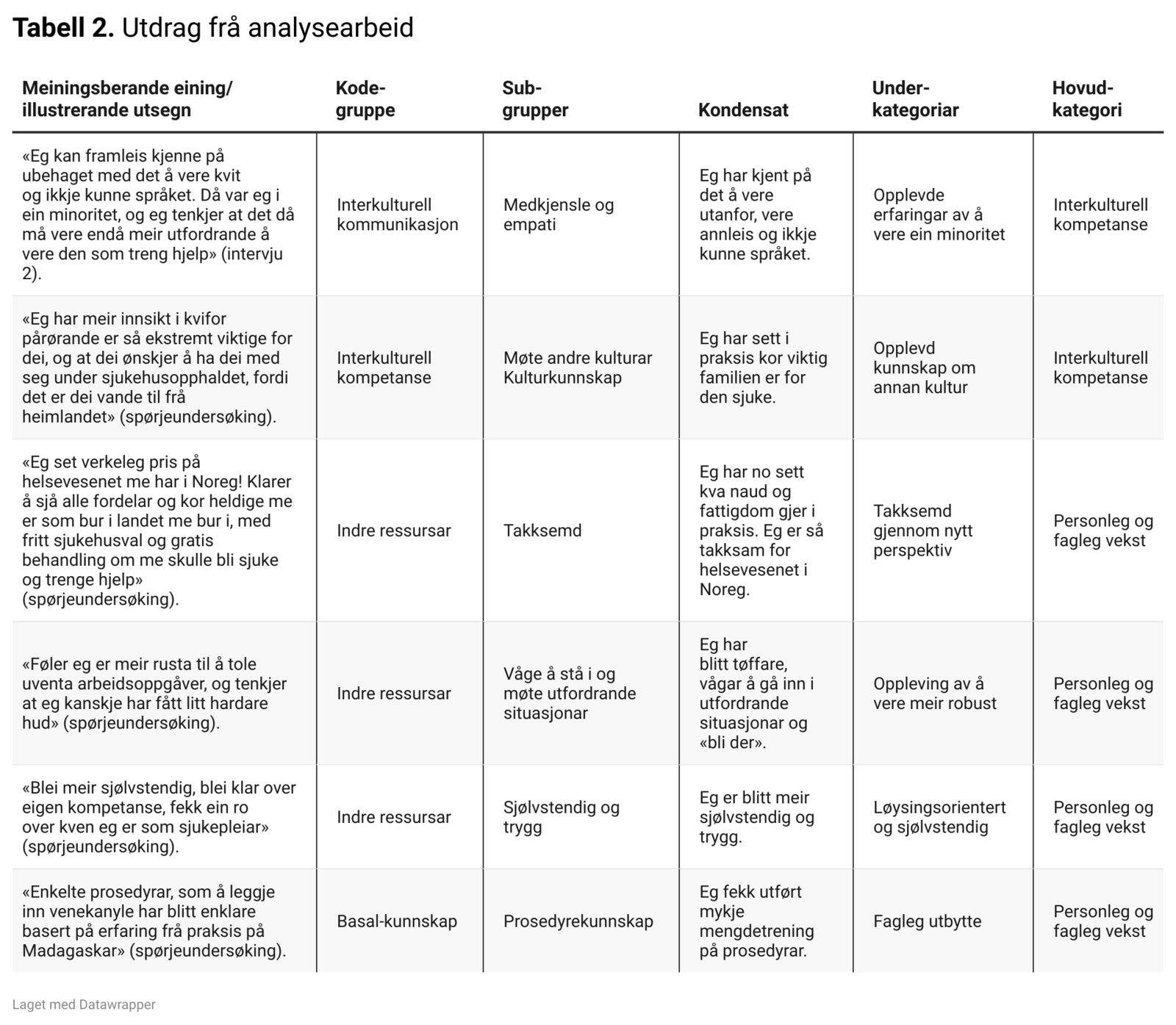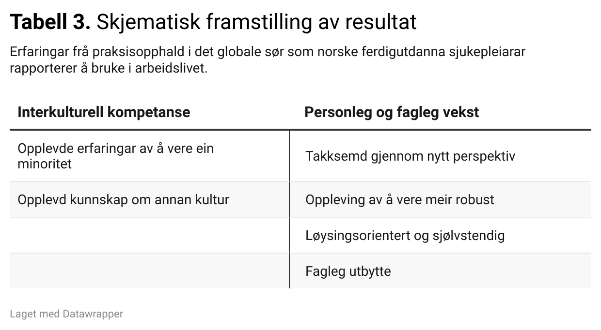 Funna frå studien viser at praksis på Madagaskar har ført til «interkulturell kompetanse» og «personleg og fagleg vekst», som har ein nytteverdi for sjukepleieutøvinga etter fullført utdanning (tabell 3).