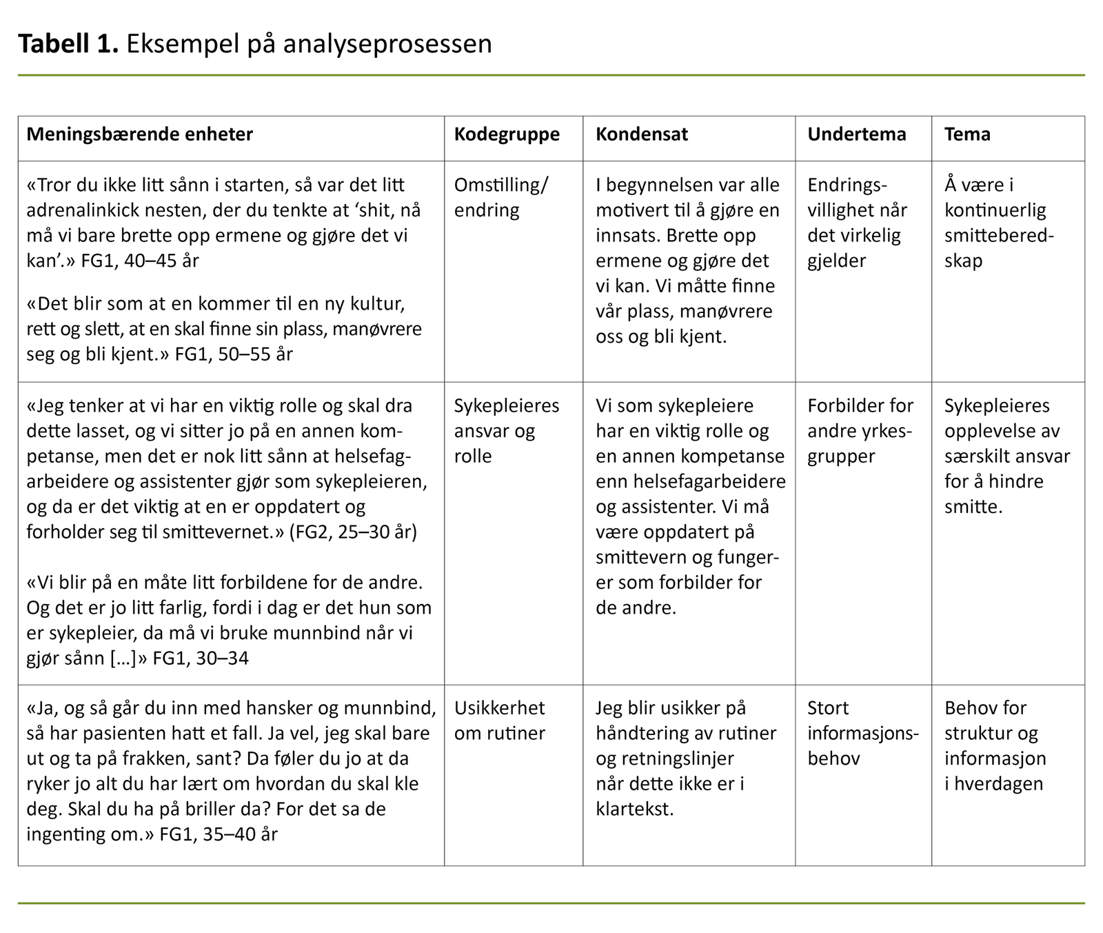 Analysen av gruppeintervjuene er basert på Malteruds systematiske tekstkondensering (17). Vi utførte den i fire trinn (se tabell 1). Vi leste det transkriberte materialet for å få et helhetsinntrykk og kunne utarbeide foreløpige temaer. Deretter ble de meningsbærende enhetene kategorisert i kodegrupper som dannet et utgangspunkt for kondensering. Kondensatet av tekstene dannet grunnlaget for temaer og undertemaer.