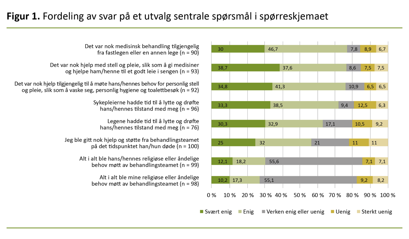 Figur 1 viser svarene på sentrale spørsmål fra de ulike tematiske områdene i spørreskjemaet. Mer enn 75 prosent av deltakerne mente at det var nok medisinsk behandling og pleie tilgjengelig for pasienten. I tillegg var det cirka 10 prosent som verken var enige eller uenige i dette. De som var uenige, cirka 15 prosent av de pårørende, fordelte seg på både hjem, sykehus og sykehjem.