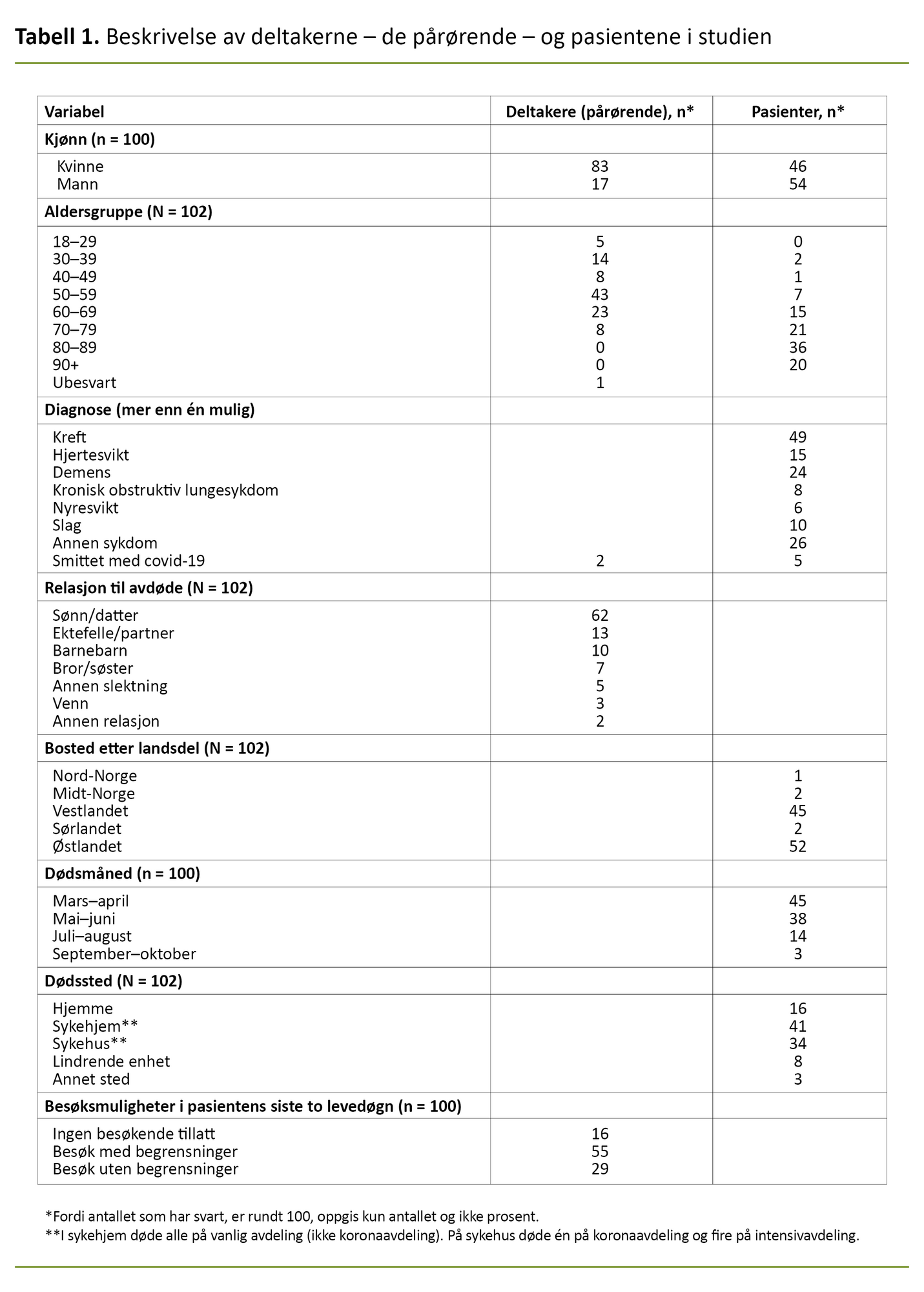 I alt 179 personer åpnet spørreskjemaet; 102 fullførte undersøkelsen og kunne inkluderes i studien. Deltakerne var pårørende. Disse pårørende og pasientene de fortalte om, er beskrevet i tabell 1. De fleste av de pårørende var kvinner i 50- og 60-årene. Pasientene var eldre; 75 prosent var over 70 år. Omtrent halvparten hadde kreft og en firedel demens. Dødsfallene var fordelt på hjem, sykehus og sykehjem.