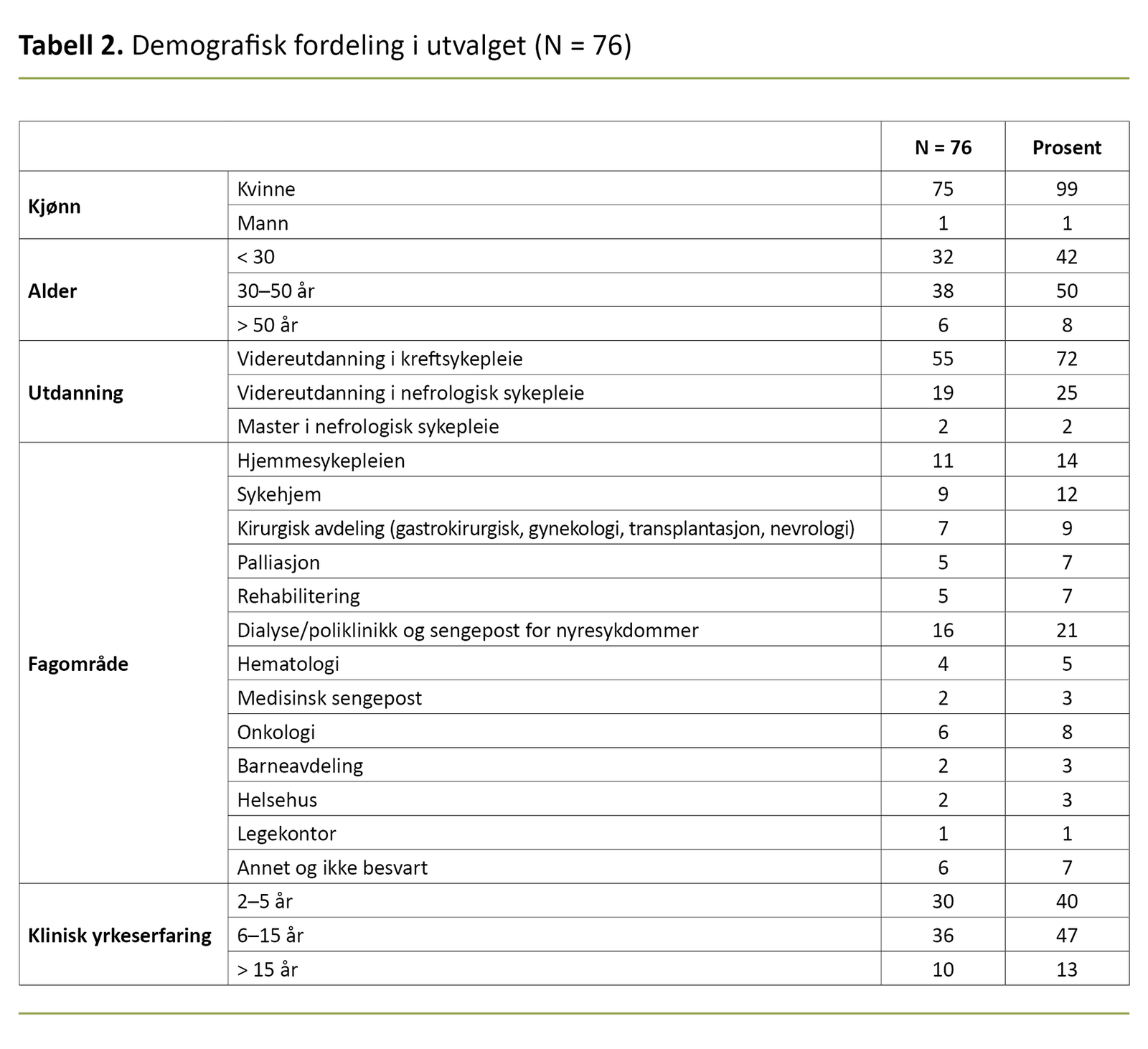 Flertallet av studentene var kvinner som tok videreutdanning i kreftsykepleie, og som arbeidet innen ulike fagområder (tabell 2). Resultatene av studien rapporteres etter Kirkpatricks firestegsmodell for evaluering (25).