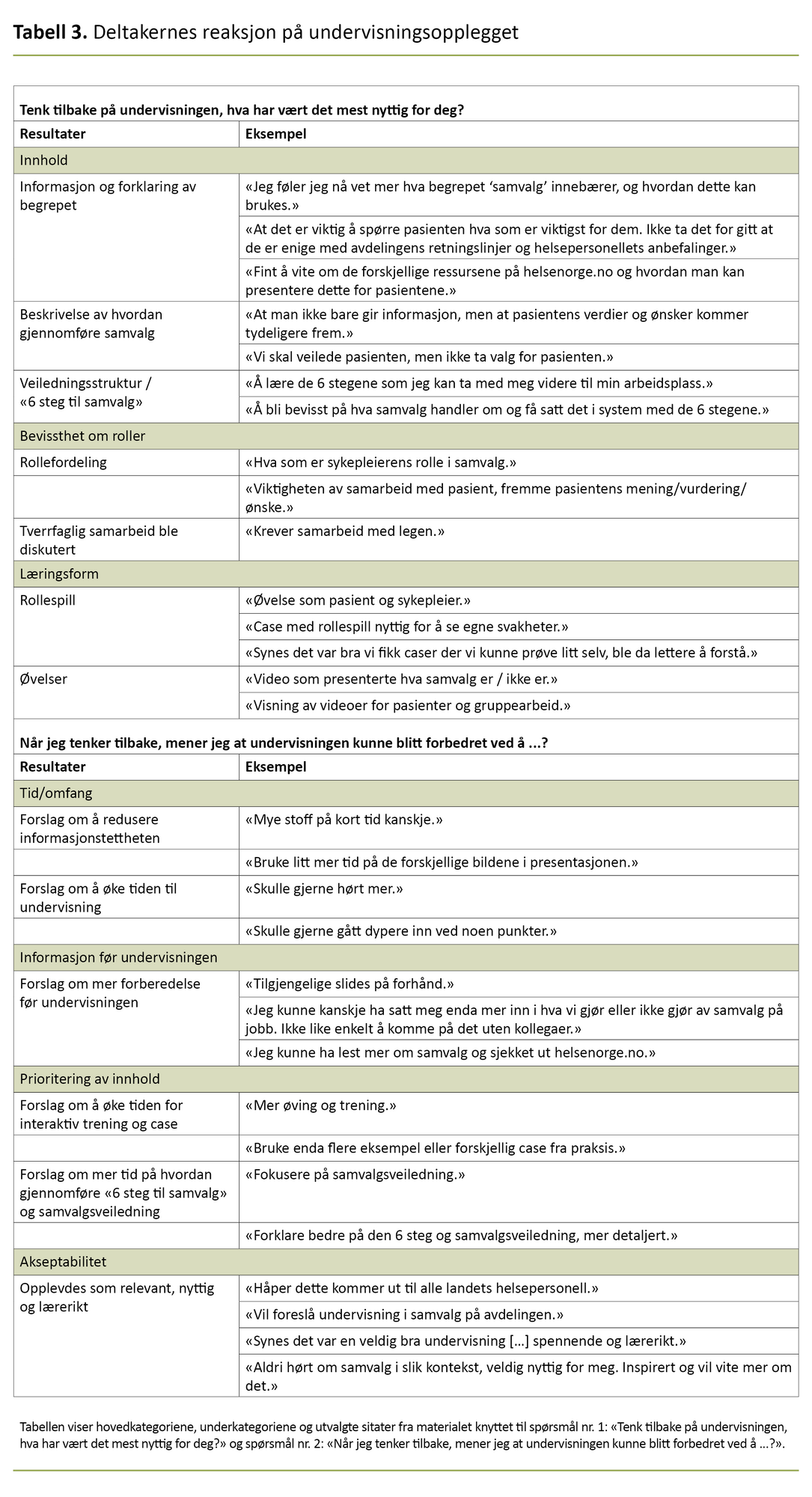 I fritekstsvarene rapporterte studentene at forklaringen av hva samvalg er, og hvordan beslutningssamtaler kan struktureres ved hjelp av «6 steg til samvalg», var noe av det nyttigste i undervisningen. Videre ble rollespill, ulike øvelser og bruk av video fremhevet som gode læringsformer (tabell 3).