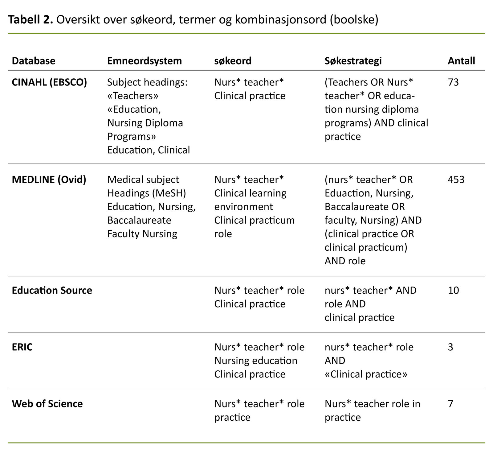 Søkestrategien var utfordrende fordi sykepleielærere og kliniske praksisstudier har flere benevnelser på engelsk. Vi søkte etter artikler der læreren hadde en tilnærmet lik rolle som i en norsk og europeisk sammenheng, det vil si å ha en delt eller hel stilling ved en utdanningsinstitusjon. Vi valgte integrativ oversiktsstudie som metode, der hensikten var å gi utfyllende data om temaet vårt. Metoden gir mulighet til å inkludere studier med forskjellige forskningsmetoder (31).