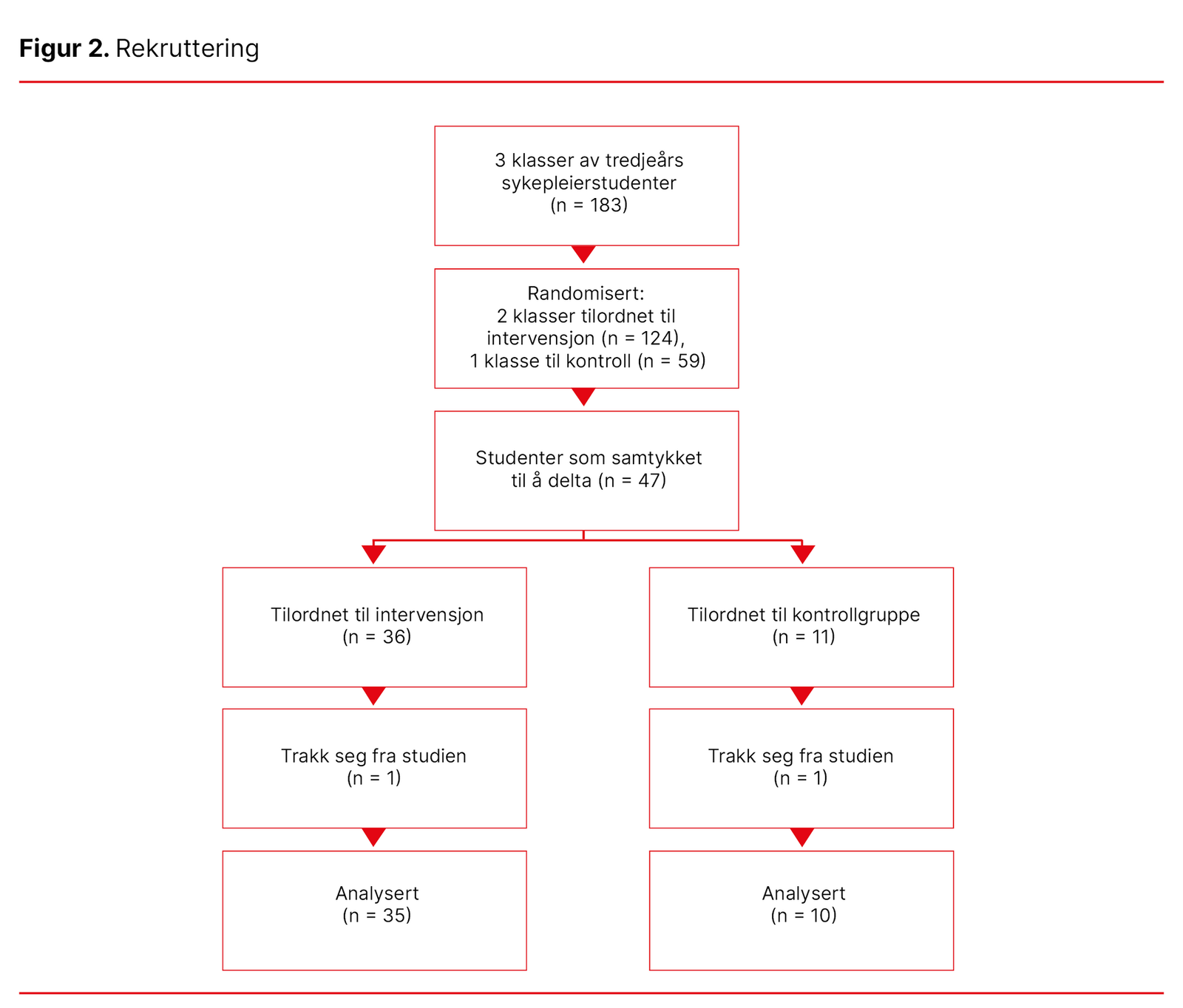 Av etiske årsaker krevde høyskolen studentene ble rekruttert fra, at alle deltakerne måtte motta intervensjonen uavhengig av gruppetilordning. Deltakerne i kontrollgruppen mottok derfor også intervensjonen, men ikke før datasamlingen for det primære utfallet var fullført (figur 1).